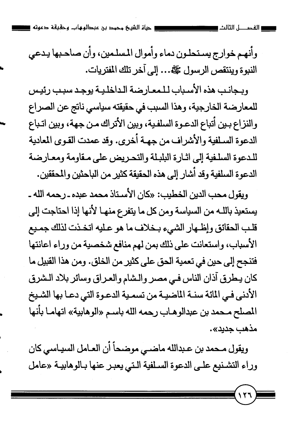 ويقول محب الدين الخطيب: "كان الأستاذ محمد عبده - رحمه الله - يستعيذ بالله من السياسة ومن كل ما يتفرع منها لأنها إذا احتاجت إلى قلب الحقائق وإظهار الشيء بخلاف ما هو عليه اتخذت لذلك جميع الأسباب، واستعانت على ذلك بمن لهم منافع شخصية من وراء إعانتها فتنجح إلى حين في تعمية الحق على كثير من الخلق. ومن هذا القبيل ما كان يطرق آذان الناس في مصر والشام والعراق وسائر بلاد الشرق الأدنى في المائة سنة الماضية من تسمية الدعوة التي دعا بها الشيخ المصلح محمد بن عبد الوهاب رحمه الله باسم "الوهابية" " اتهاما بأنها مذهب جديد".