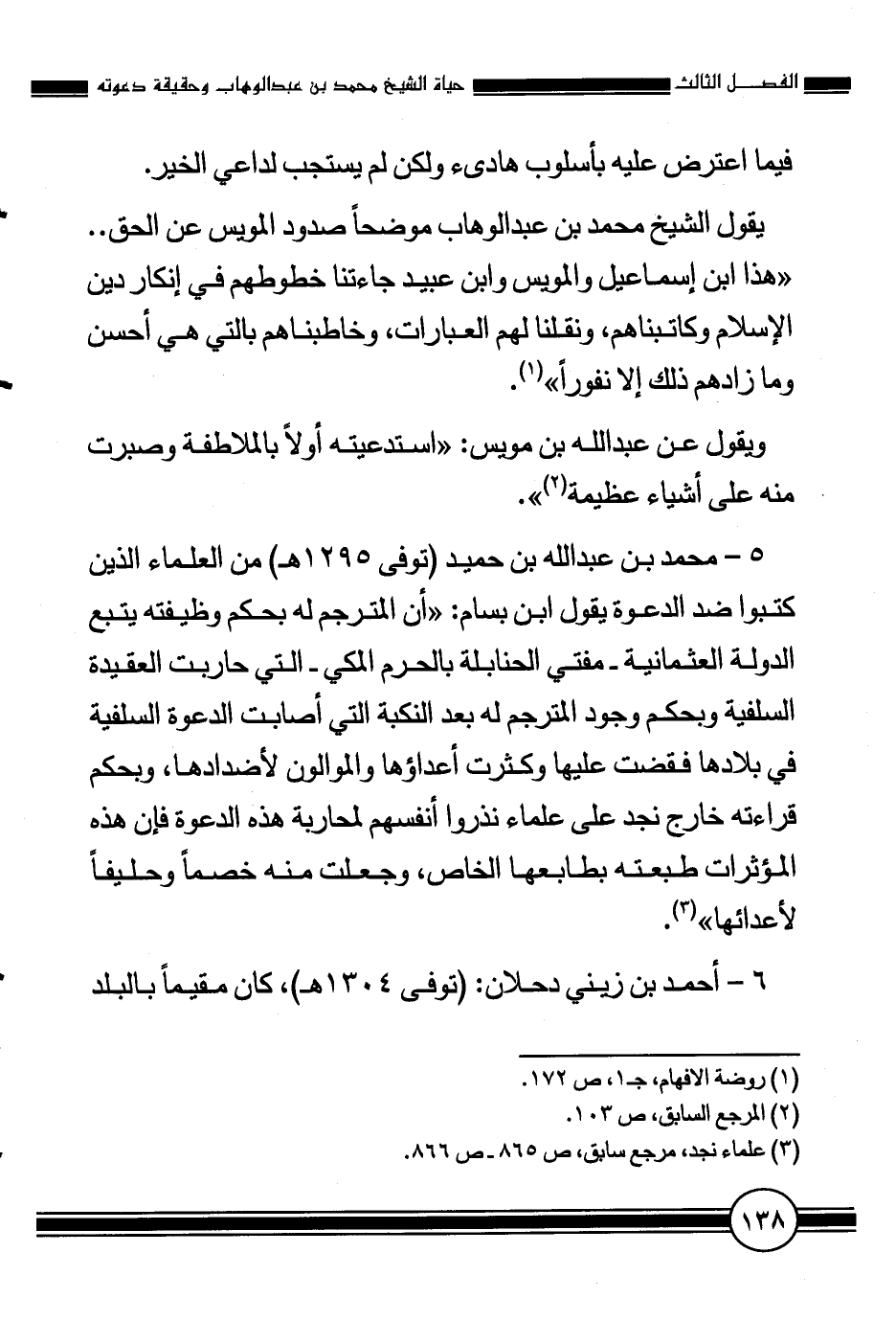 5- محمد بن عبد الله بن حميد"توفي 1295هـ" من العلماء الذين كتبوا ضد الدعوة يقول ابن بسام: "إن المترجم له بحكم وظيفته يتبع الدولة العثمانية - مفتي الحنابلة بالحرم المكي - التي حاربت العقيدة السلفية وبحكم وجود المترجم له بعد النكبة التي أصابت الدعوة السلفية في بلادها فقضت عليها وكثرت أعداؤها والموالون لأضدادها، وبحكم قراءته خارج نجد على علماء نذروا أنفسهم لمحاربة هذه الدعوة فإن هذه المؤثرات طبعته بطابعها الخاص، وجعلت منه خصماً وحليفاً لأعدائها"3.