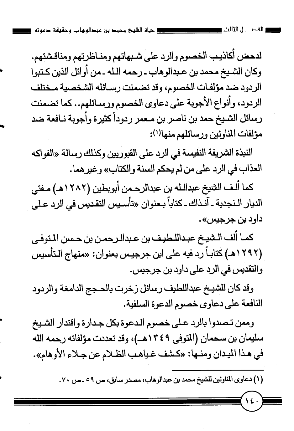 كما ألف الشيخ عبد اللطيف بن عبد الرحمن بن حسن المتوفى"1292 هـ" كتابا رد فيه على ابن جرجيس بعنوان: "منهاج التأسيس والتقديس في الرد على داود ابن جرجيس".