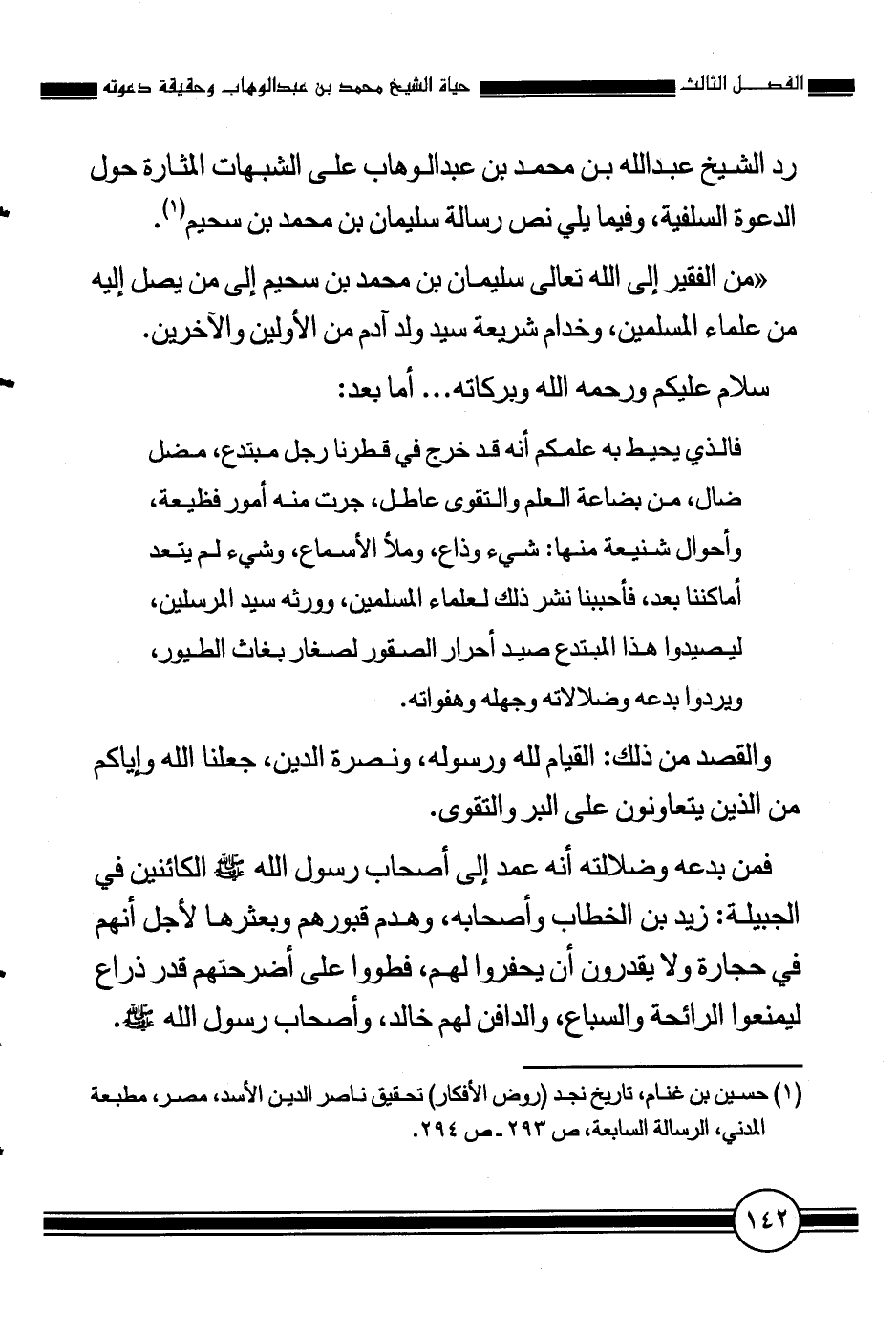 رد الشيخ عبد الله بن محمد بن عبد الوهاب على الشبهات المثارة حول الدعوة السلفية، وفيما يلي نص رسالة سليمان بن محمد بن سحيم1.