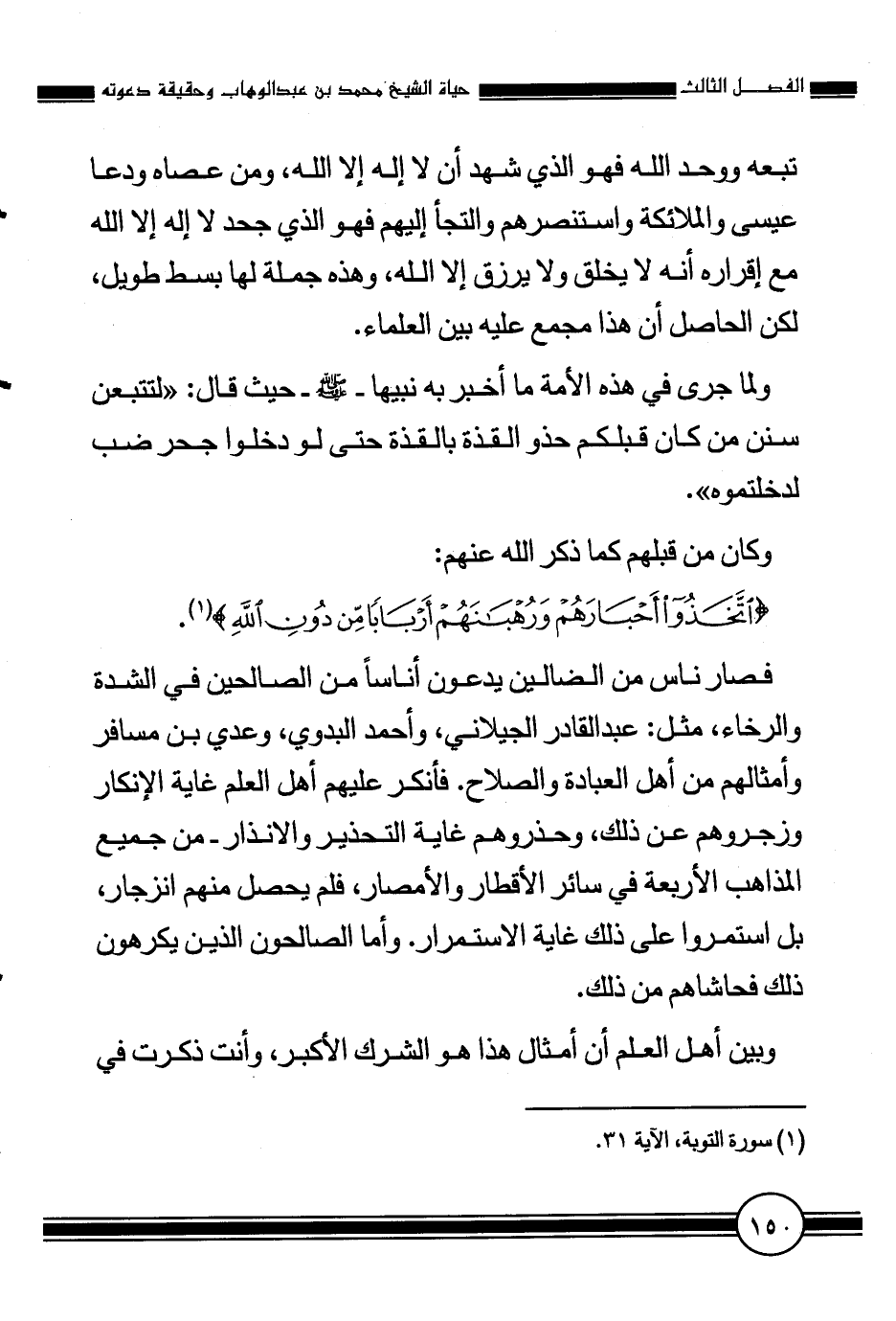فصار ناس من الضالين يدعون أناساً من الصالحين في الشدة والرخاء، مثل: عبد القادر الجيلاني، وأحمد البدوي، وعدي بن مسافر وأمثالهم من أهل العبادة والصلاح. فأنكر عليهم أهل العلم غاية الإنكار وزجروهم عن ذلك، وحذروهم غاية التحذير والإنذار- من جميع المذاهب الأربعة في سائر الأقطار والأمصار، فلم يحصل منهم انزجار، بل استمروا على ذلك غاية الاستمرار. وأما الصالحون الذين يكرهون ذلك فحاشاهم من ذلك.