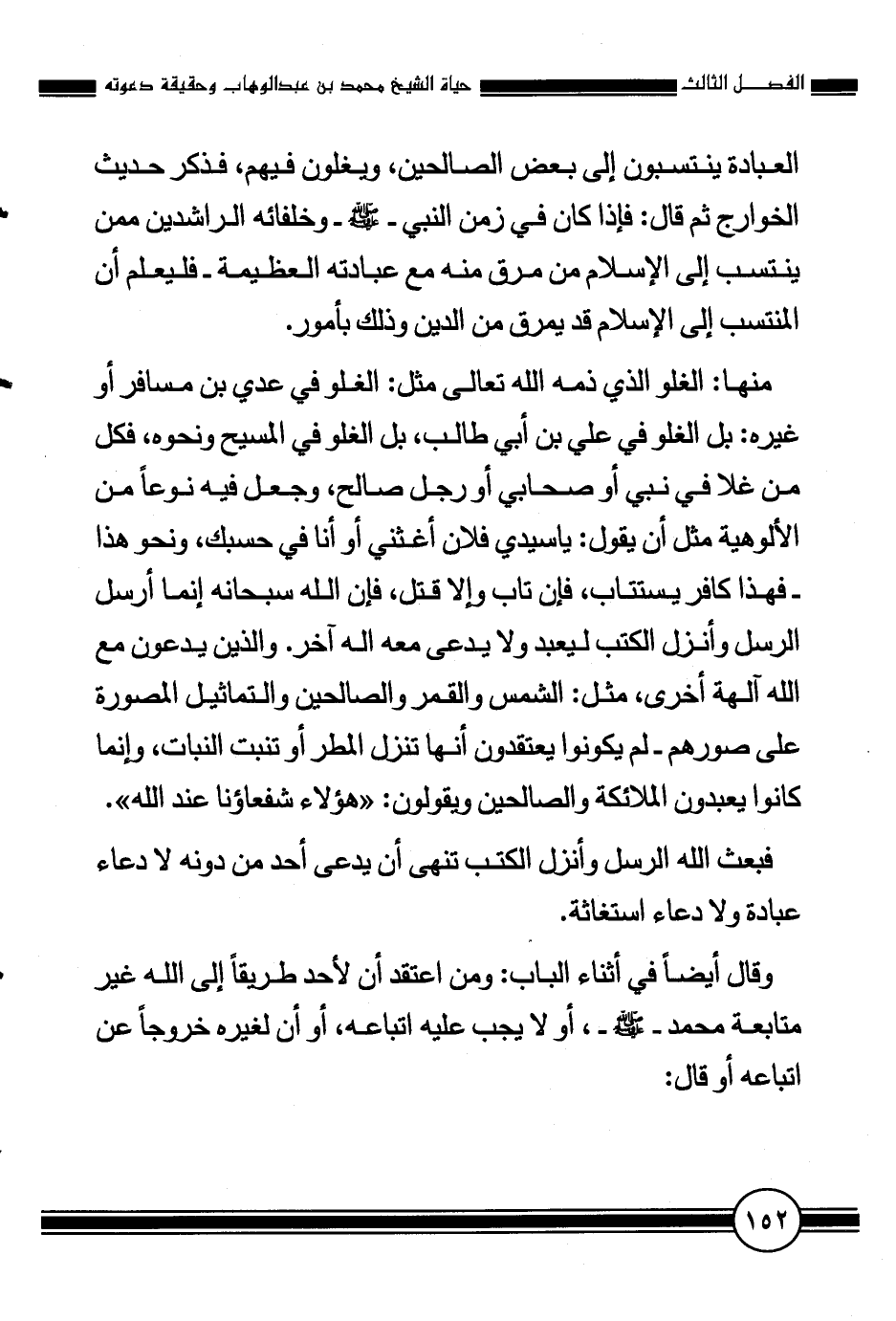 العبادة ينتسبون إلى بعض الصالحين، ويغلون فيهم، فذكر حديث الخوارج ثم قال: فإذا كان في زمن النبي صلّى الله عليه وسلّم وخلفائه الراشدين ممن ينتسب إلى الإسلام من مرق منه مع عبادته العظيمة- فليعلم أن المنتسب إلى الإسلام قد يمرق من الدين وذلك بأمور.