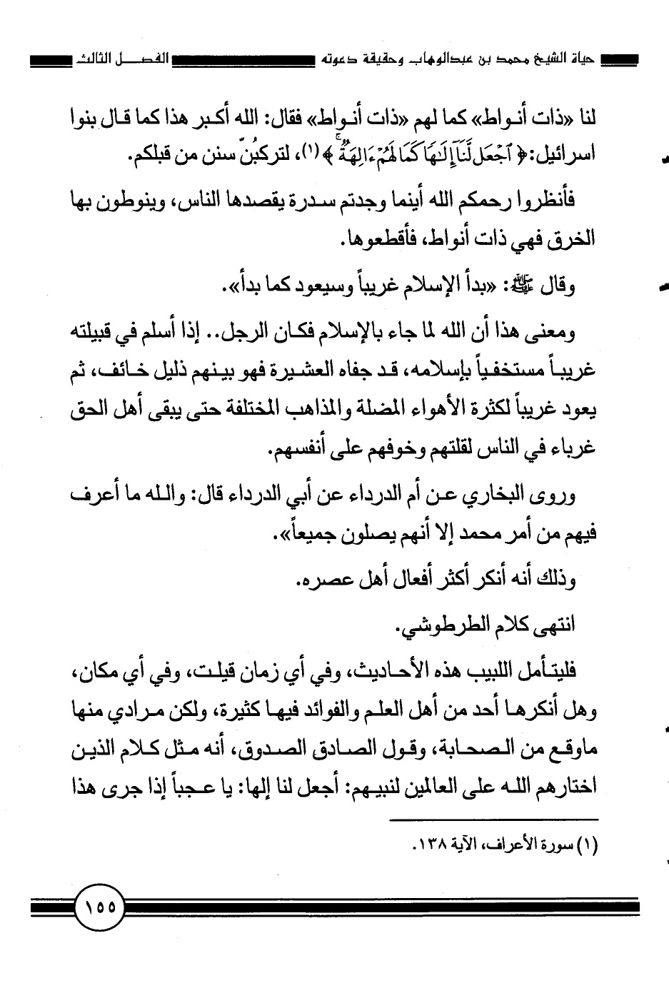 فليتأمل اللبيب هذه الأحاديث، وفي أي زمان قيلت، وفي أي مكان، وهل أنكرها أحد من أهل العلم والفوائد فيها كثيرة، ولكن مرادي منها ما وقع من الصحابة، وقول الصادق المصدوق، أنه مثل كلام الذين اختارهم الله على العالمين لنبيهم: أجعل لنا إلها: يا عجبا إذا جرى هذا