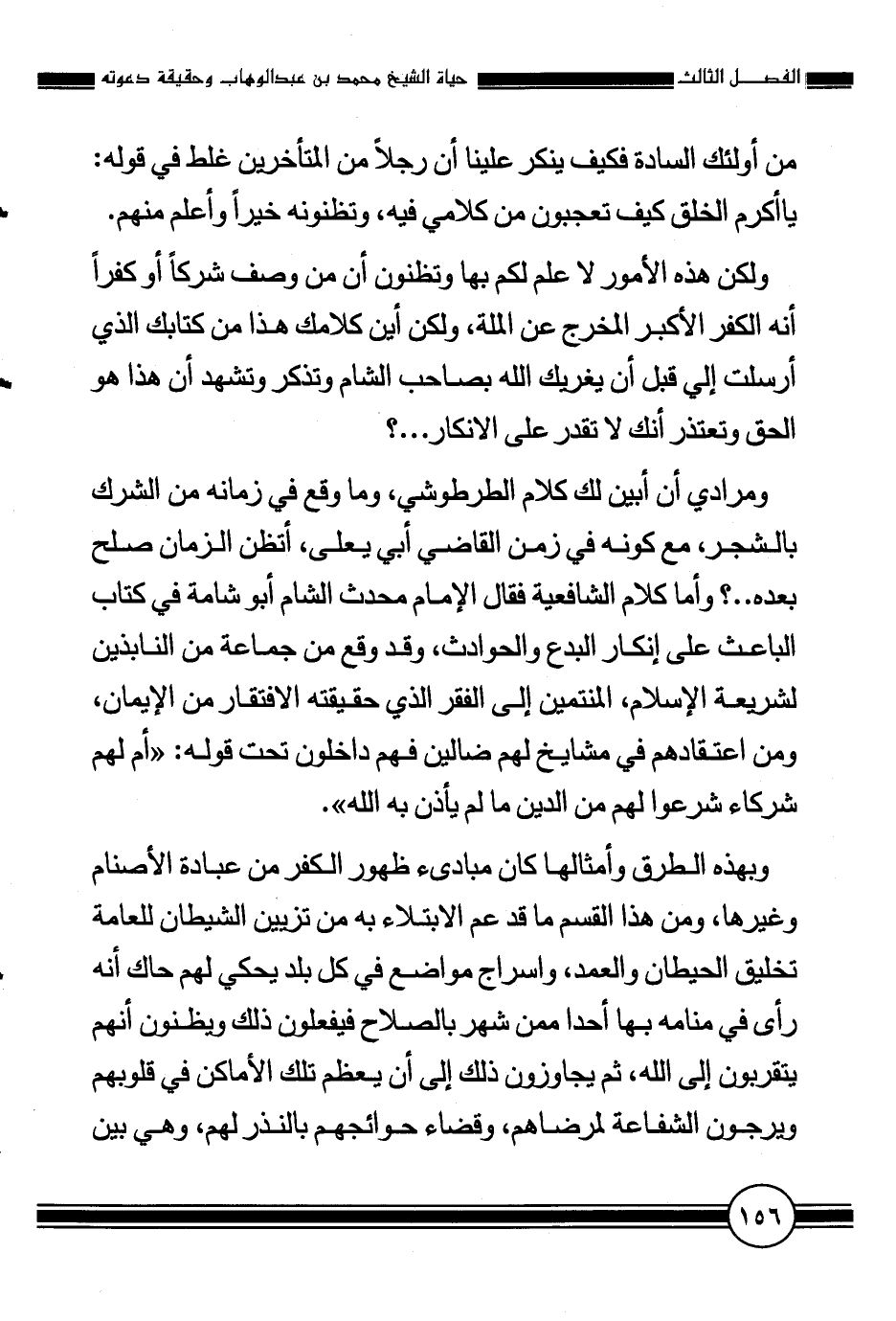 ومرادي أن أبين لك كلام الطرطوشي، وما وقع في زمانه من الشرك بالشجر، مع كونه في زمن القاضي أبي يعلى، أتظن الزمان صلح بعده..؟ وأما كلام الشافعية فقال الإمام محدث الشام أبو شامة في كتاب الباعث على إنكار البدع والحوادث، وقد وقع من جماعة من النابذين لشريعة الإسلام، المنتمين إلى الفقر الذي حقيقته الافتقار من الإيمان، ومن اعتقادهم في مشايخ لهم ضالين فهم داخلون تحت قوله: {أَمْ لَهُمْ شُرَكَاءُ شَرَعُوا لَهُمْ مِنَ الدِّينِ مَا لَمْ يَأْذَنْ بِهِ اللَّهُ} [الشّورى من الآية: 21] .