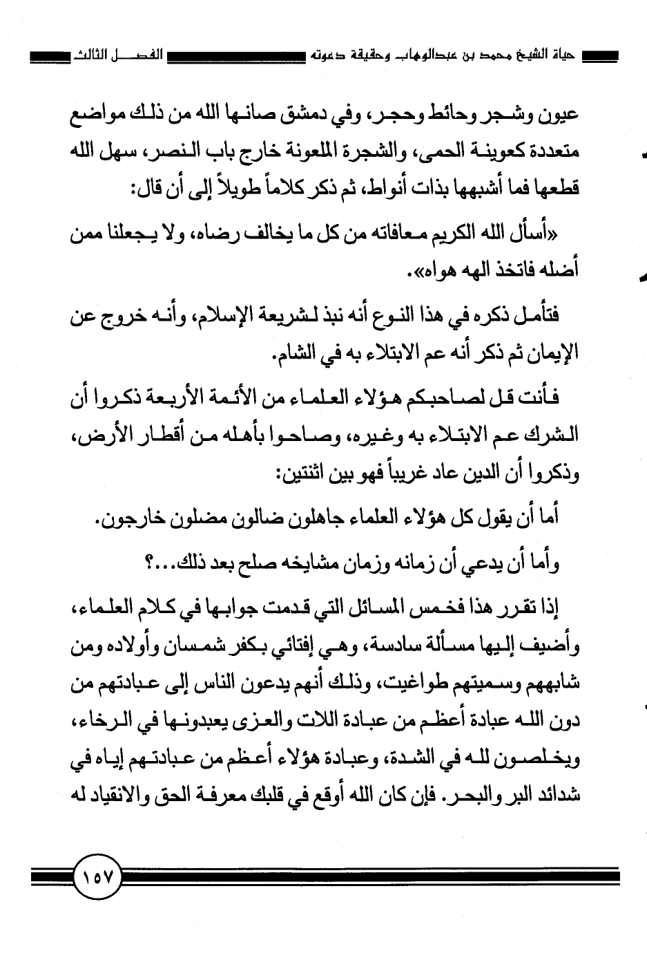 عيون وشجر وحائط وحجر، وفي دمشق صانها الله من ذلك مواضع متعددة كعوينة الحمى، والشجرة الملعونة خارج باب النصر، سهل الله قطعها فما أشبهها بذات أنواط"، ثم ذكر كلاماً طويلاً إلى أن قال: "أسأل الله الكريم معافاته من كل ما يخالف رضاه، ولا يجعلنا ممن أضله فاتخذ إلهه هواه".
