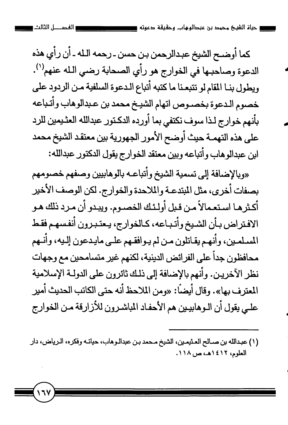 "وبالإضافة إلى تسمية الشيخ وأتباعه بالوهابيين وصفهم خصومهم بصفات أخرى، مثل المبتدعة والملاحدة والخوارج. لكن الوصف الأخير أكثرها استعمالاً من قبل أولئك الخصوم. ويبدو أن مرد ذلك هو الافتراض بأن الشيخ وأتباعه، كالخوارج، يعتبرون أنفسهم فقط المسلمين، وأنهم يقاتلون من لم يوافقهم على ما يدعون إليه، وأنهم محافظون جداً على الفرائض الدينية، لكنهم غير متسامحين مع وجهات نظر الآخرين. وأنهم بالإضافة إلى ذلك ثائرون على الدولة الإسلامية المعترف بها".