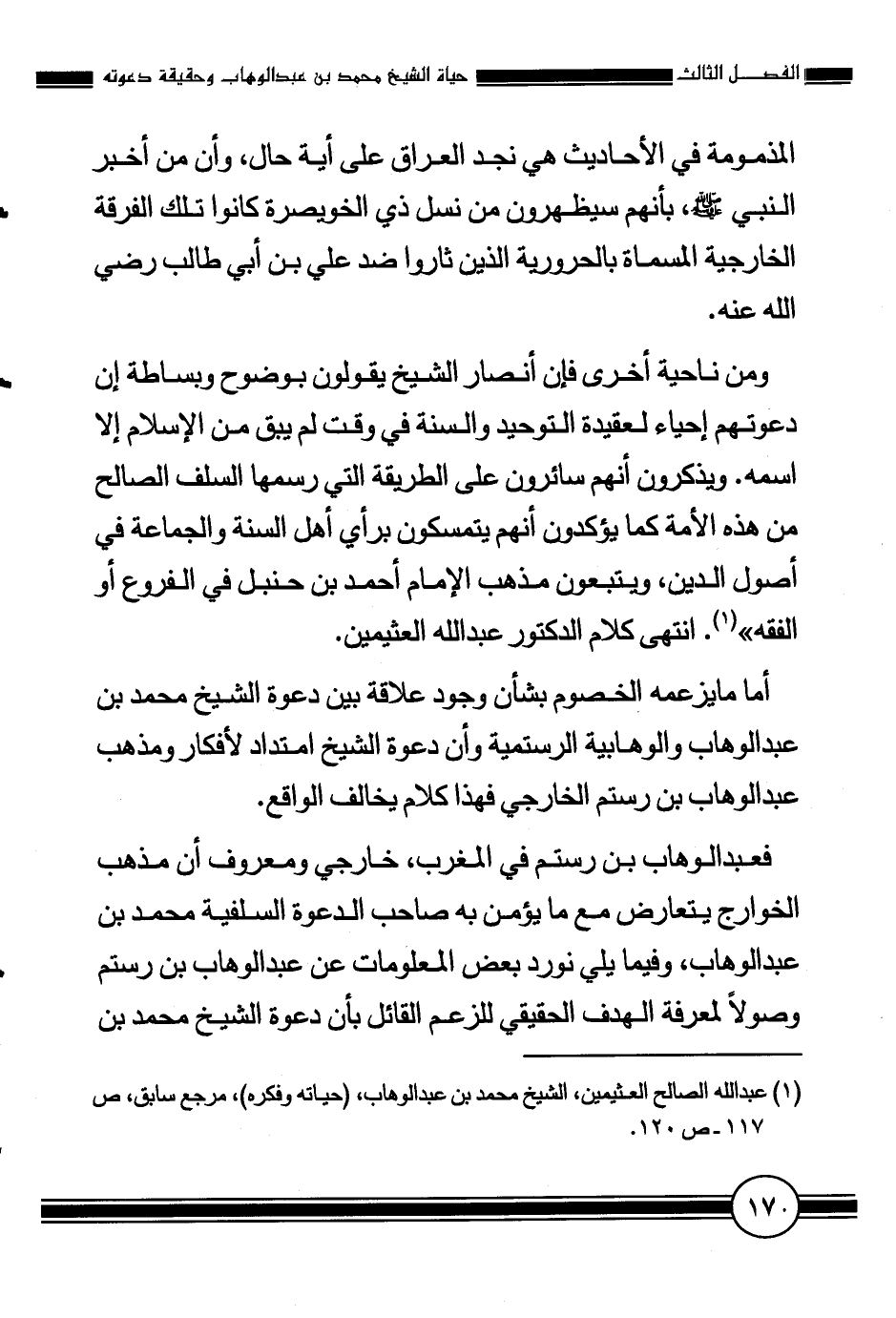 ومن ناحية أخرى فإن أنصار الشيخ يقولون بوضوح وبساطة إن دعوتهم إحياء لعقيدة التوحيد والسنة في وقت لم يبق من الإسلام إلا اسمه. ويذكرون أنهم سائرون على الطريقة التي رسمها السلف الصالح من هذه الأمة كما يؤكدون أنهم يتمسكون برأي أهل السنة والجماعة في أصول الدين، ويتبعون مذهب الإمام أحمد بن حنبل في الفروع أو الفقه"انتهى كلام الدكتور عبد الله العثيمين.