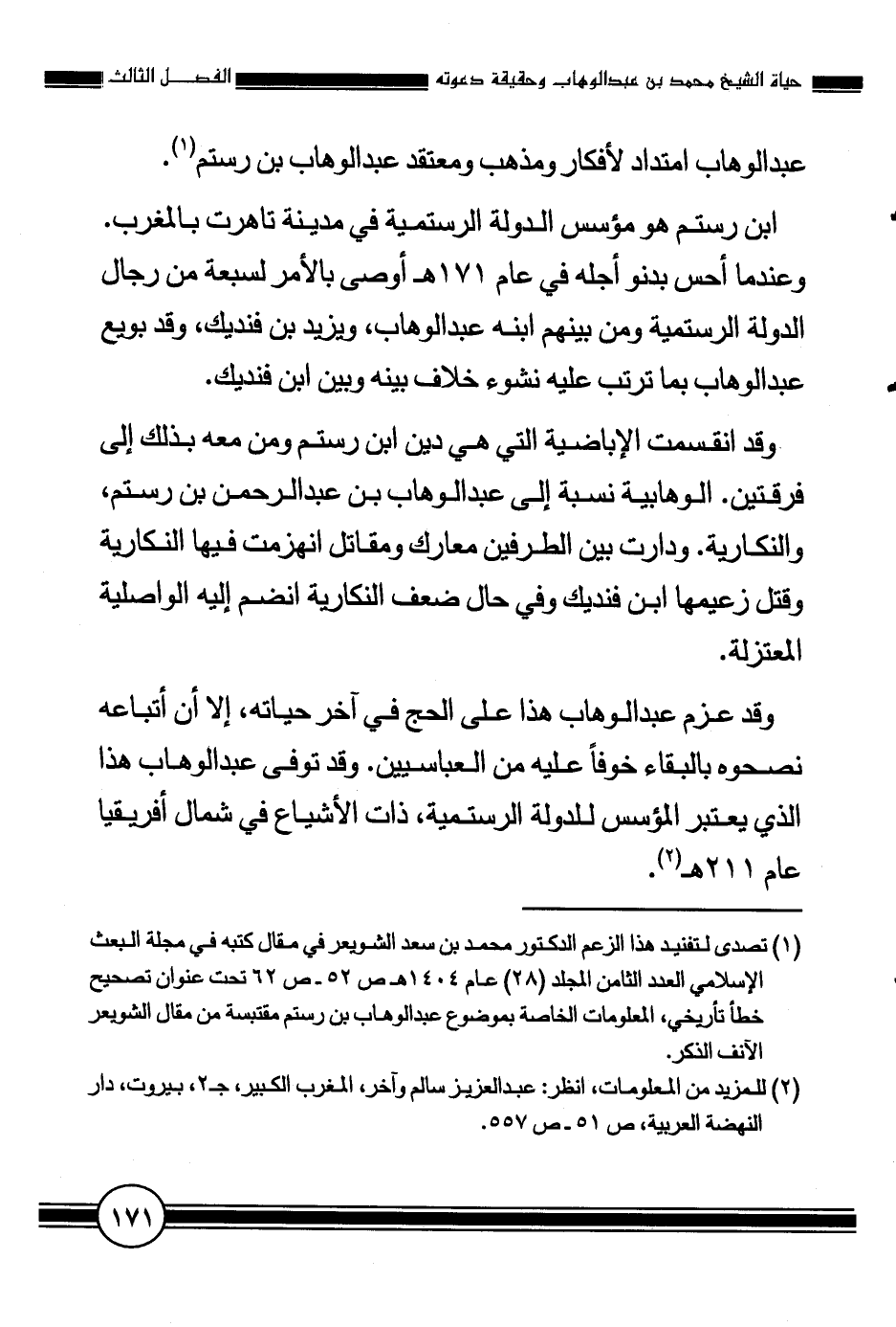 1 تصدى لتفنيد هذا الزعم الدكتور محمد بن سعد الشويعر في مقال كتبه في مجلة البعث الإسلامي العدد الثامن المجلد "28" عام 1404هـ ص52- ص62 تحت عنوان تصحيح خطأ تاريخي، المعلومات الخاصة بموضوع عبد الوهاب بن رستم مقتبسة من مقال الشويعر الآنف الذكر.