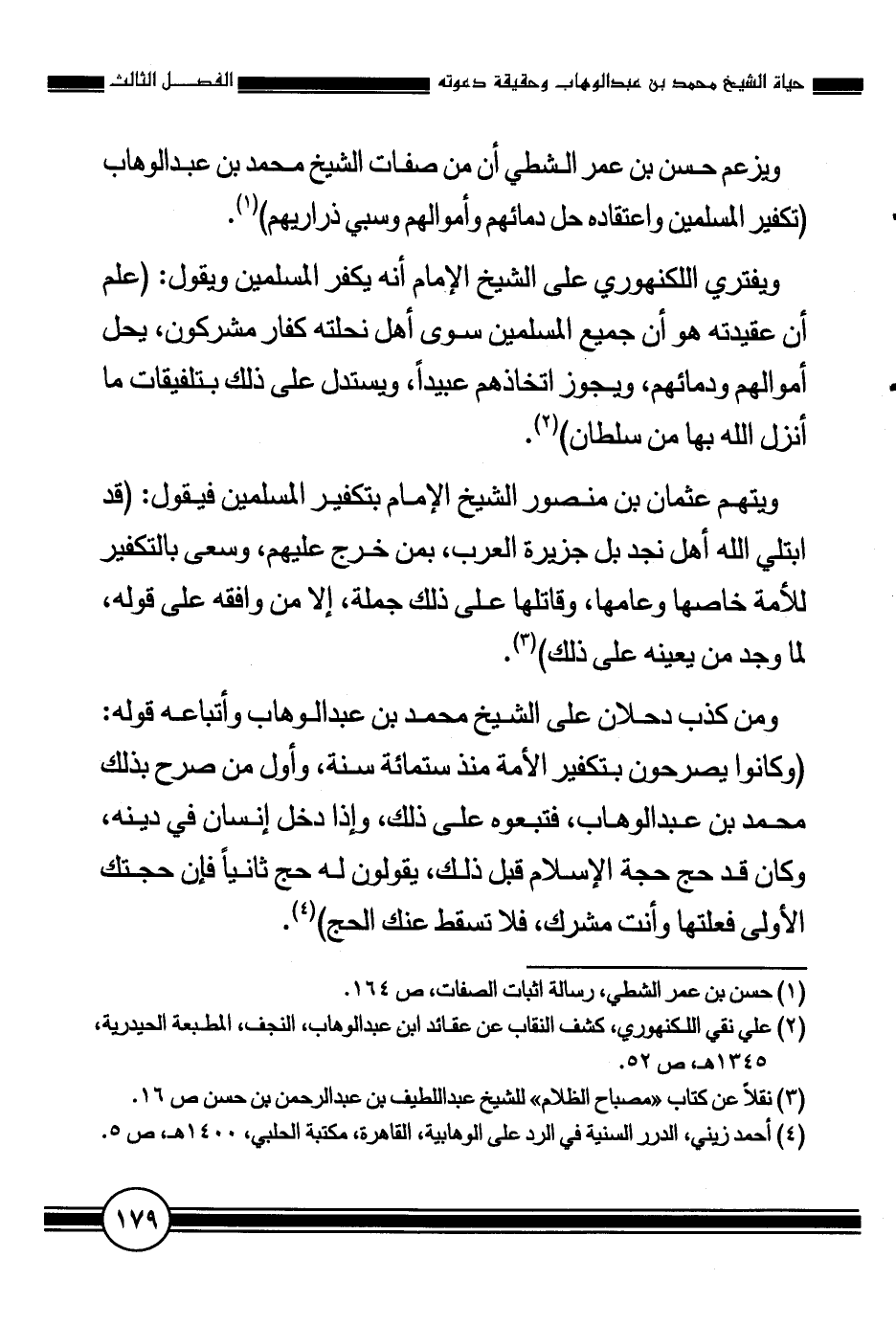 ويزعم حسن بن عمر الشطي أن من صفات الشيخ محمد بن عبد الوهاب:"تكفير المسلمين واعتقاده حل دمائهم وأموالهم وسبي ذراريهم"1.
