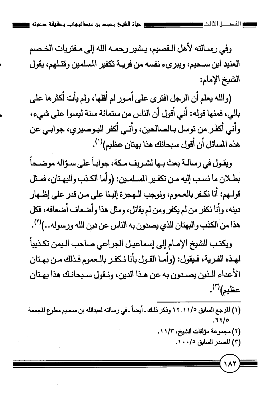 وفي رسالته لأهل القصيم، يشير رحمه الله إلى مفتريات الخصم العنيد ابن سحيم، ويبرئ نفسه من فرية تكفير المسلمين وقتلهم، يقول الشيخ الإمام: