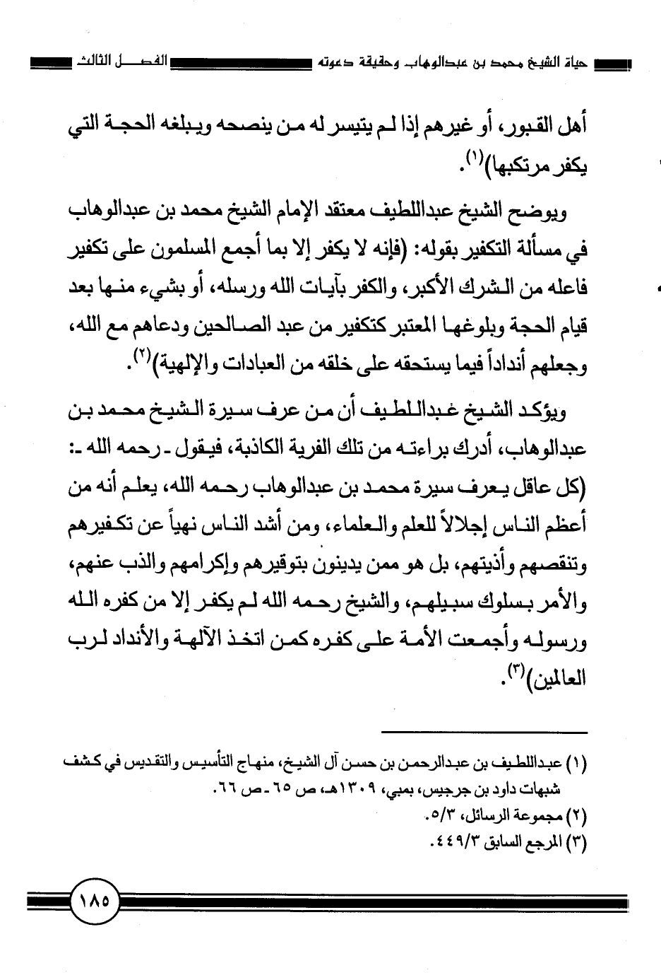 1 عبد اللطيف بن عبد الرحمن بن حسن آل الشيخ، منهاج التأسيس والتقديس في كشف شبهات داود بن جرجيس، بمبي، 1309 هـ، ص 65- ص 66.