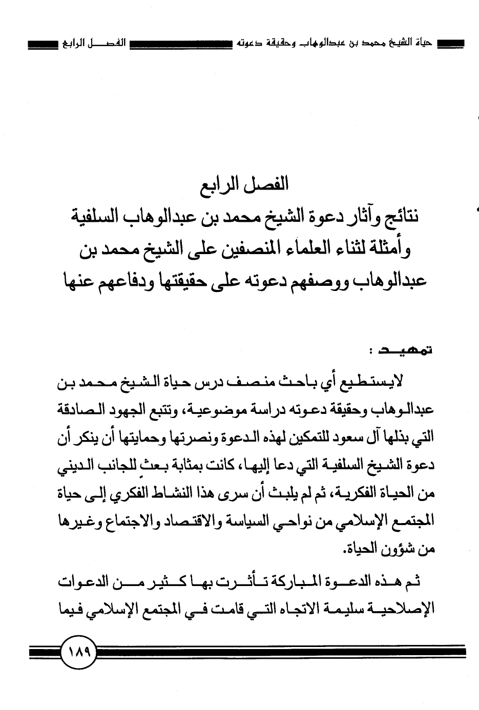 الفصل الرابع: نتائج وآثار دعوة الشيخ محمد بن عبد الوهاب السلفية وأمثلة لثناء العلماء المنصفين على الشيخ محمد بن عبد الوهاب ووصفهم دعوته على حقيقتها ودفاعهم عنها