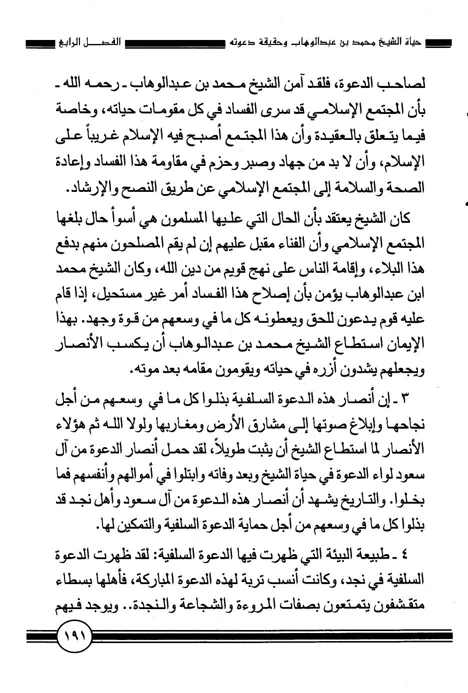 3- إن أنصار هذه الدعوة السلفية بذلوا كل ما في وسعهم من أجل نجاحها وإبلاغ صوتها إلى مشارق الأرض ومغاربها ولولا الله ثم هؤلاء الأنصار لما استطاع الشيخ أن يثبت طويلاً، لقد حمل أنصار الدعوة من آل سعود لواء الدعوة في حياة الشيخ وبعد وفاته وابتلوا في أموالهم وأنفسهم فما بخلوا. والتاريخ يشهد أن أنصار هذه الدعوة من آل سعود وأهل نجد قد بذلوا كل ما في وسعهم من أجل حماية الدعوة السلفية والتمكين لها.