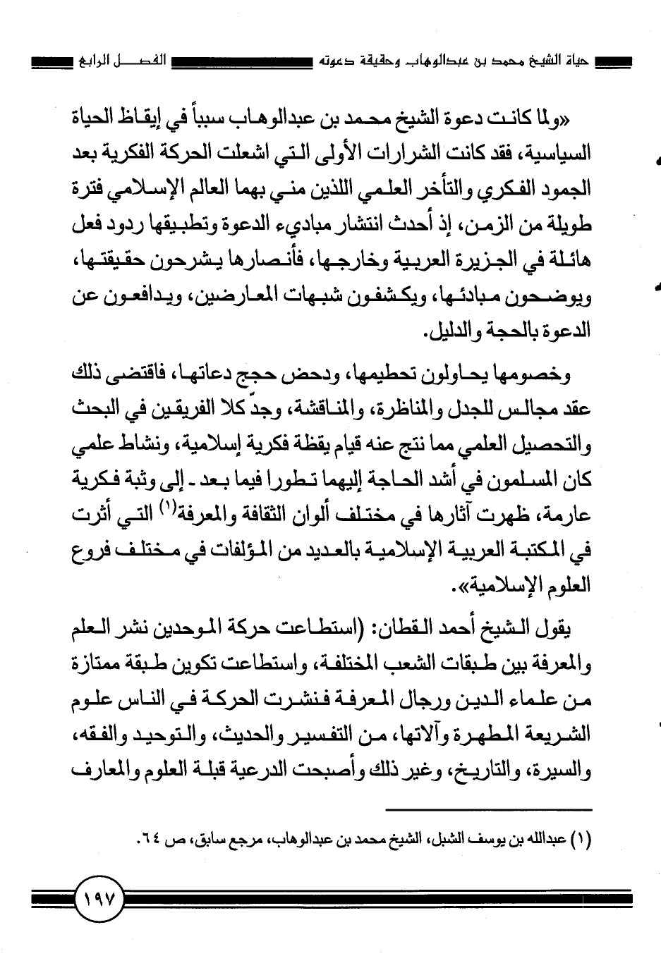 "ولما كانت دعوة الشيخ محمد بن عبد الوهاب سبباً في إيقاظ الحياة السياسية، فقد كانت الشرارات الأولى التي أشعلت الحركة الفكرية بعد الجمود الفكري والتأخر العلمي اللذين مني بهما العالم الإسلامي فترة طويلة من الزمن، إذ أحدث انتشار مبادئ الدعوة وتطبيقها ردود فعل هائلة في الجزيرة العربية وخارجها، فأنصارها يشرحون حقيقتها، ويوضحون مبادئها، ويكشفون شبهات المعارضين، ويدافعون عن الدعوة بالحجة والدليل.