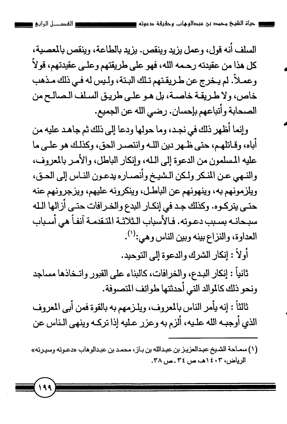 وإنما أظهر ذلك في نجد، وما حولها ودعا إلى ذلك ثم جاهد عليه من أباه، وقاتلهم، حتى ظهر دين الله وانتصر الحق، وكذلك هو على ما عليه المسلمون من الدعوة إلى الله، وإنكار الباطل، والأمر بالمعروف، والنهي عن المنكر ولكن الشيخ وأنصاره يدعون الناس إلى الحق، ويلزمونهم به، وينهونهم عن الباطل، وينكرونه عليهم، ويزجرونهم عنه حتى يتركوه. وكذلك جدّ في إنكار البدع والخرافات حتى أزالها الله سبحانه بسبب دعوته. فالأسباب الثلاثة المتقدمة آنفاً هي أسباب العداوة، والنّزاع بينه وبين الناس وهي: