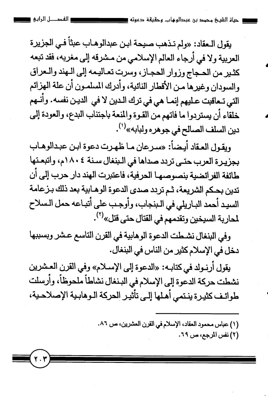 ويقول العقاد أيضا: "سرعان ما ظهرت دعوة ابن عبد الوهاب بجزيرة العرب حتى تردد صداها في البنغال سنة 1804 م، واتبعتها طائفة الفرائضية بنصوصها الحرفية، فاعتبرت الهند دار حرب إلى أن تدين بحكم الشريعة، ثم تردد صدى الدعوة الوهابية بعد ذلك بزعامة السيد أحمد الباريلي في البنجاب، وأوجب على أتباعه حمل السلاح لمحاربة السيخين وتقدمهم في القتال حتى قتل"2.