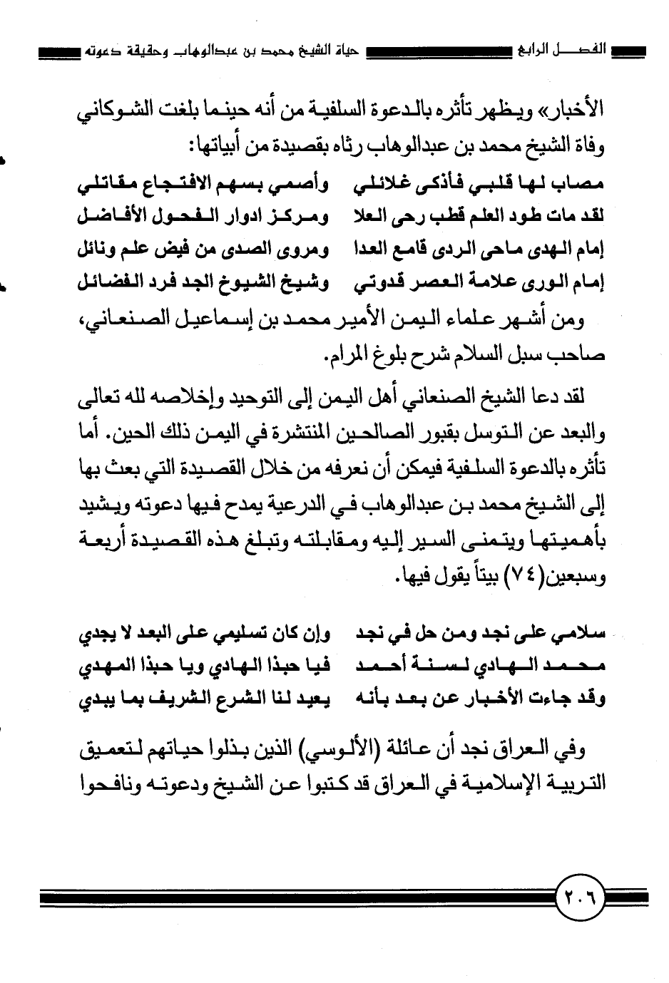 الأخبار " ويظهر تأثره بالدعوة السلفية من أنه حينما بلغت الشوكاني وفاة الشيخ محمد بن عبد الوهاب رثاه بقصيدة من أبياتها: