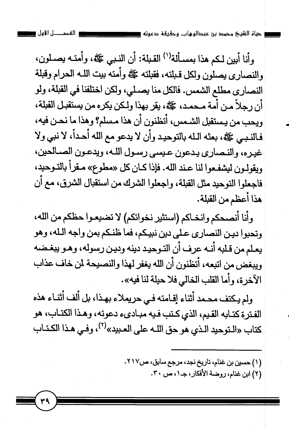 وأنا أبين لكم هذه بمسألةالقبلة: أن النبي صلّى الله عليه وسلّم وأمته يصلون، والنصارى يصلون ولكل قبلته، فقبلته صلّى الله عليه وسلّم وأمته بيت الله الحرام وقبلة النصارى مطلع الشمس. فالكل منا يصلي، ولكن اختلفنا في القبلة، ولو أن رجلا من أمة محمد صلّى الله عليه وسلّم يقر بهذا ولكن يكره من يستقبل القبلة، ويحب من يستقبل الشمس، أتظنون أن هذا مسلم؟ وهذا ما نحن فيه، فالنبي صلّى الله عليه وسلّم بعثه الله بالتوحيد وأن لا يدعو مع الله أحدا، لا نبي ولا غيره، والنصارى يدعون عيسى رسول الله، ويدعون الصالحين، ويقولون ليشفعوا لنا عند الله. فإذا كان كل "مطوع"" مقرا بالتوحيد، فاجعلوا التوحيد مثل القبلة، واجعلوا الشرك من استقبال الشرق، مع أن هذا أعظم من القبلة.