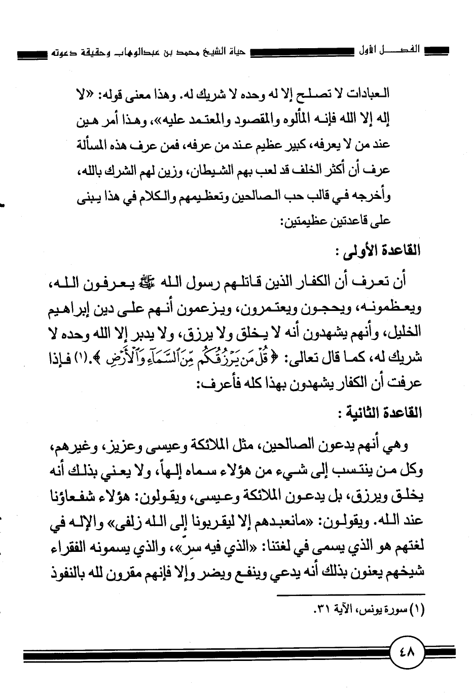 أن تعرف أن الكفار الذين قاتلهم رسول الله صلّى الله عليه وسلّم يعرفون الله، ويعظمونه، ويحجون ويعتمرون، ويزعمون أنهم على دين إبراهيم الخليل، وأنهم يشهدون أنه لا يخلق ولا يرزق، ولا يدبر إلا الله وحده لا شريك له، كما قال تعالى: {قُلْ مَنْ يَرْزُقُكُمْ مِنَ السَّمَاءِ وَالْأَرْضِ} [يونس، من الآية: 31] . فإذا عرفت أن الكفار يشهدون بهذا كله فأعرف: