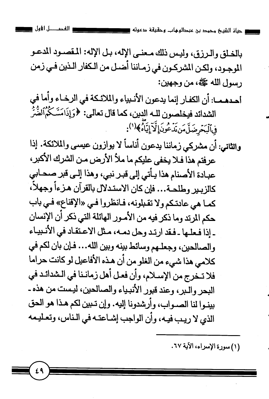 والثاني: أن مشركي زماننا يدعون أناسا لا يوازون عيسى والملائكة. إذا عرفتم هذا فلا يخفى عليكم ما ملأ الأرض من الشرك الأكبر، عبادة الأصنام هذا يأتي إلى قبر نبي وهذا إلى قبر صحابي كالزبير وطلحة ... فإن كان الاستدلال بالقرآن هزئا وجهلا، كما هي عادتكم ولا تقبلونه، فانظروا في "الإقناع " في باب حكم المرتد وما ذكر فيه من الأمور الهائلة التي ذكر أن الإنسان إذا فعلها- فقد ارتد وحل دمه، مثل الاعتقاد في الأنبياء والصالحين، وجعلهم وسائط بينه وبين الله ... فإن بان لكم في كلامي هذا شيء من الغلو من أن هذه الأفاعيل لو كانت حراما فلا تخرج من الإسلام، وأن فعل أهل زماننا في الشدائد في البحر والبر، وعند قبور الأنبياء والصالحين، ليست من هذه.