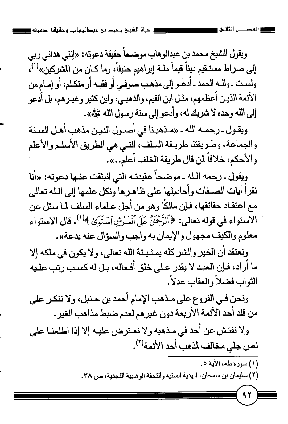 ويقول الشيخ محمد بن عبد الوهاب موضحاً حقيقة دعوته: {قُلْ إِنَّنِي هَدَانِي رَبِّي إِلَى صِرَاطٍ مُسْتَقِيمٍ دِيناً قِيَماً مِلَّةَ إِبْرَاهِيمَ حَنِيفاً وَمَا كَانَ مِنَ الْمُشْرِكِينَ} [الأنعام من الآية: 161] ولست -ولله الحمد- أدعو إلى مذهب صوفي أو فقيه أو متكلم، أو إمام من الأئمة الذين أعظمهم، مثل ابن القيم، والذهبي، وابن كثير وغيرهم، بل أدعو إلى الله وحده لا شريك له، وأدعو إلى سنة رسول الله صلّى الله عليه وسلّم ".