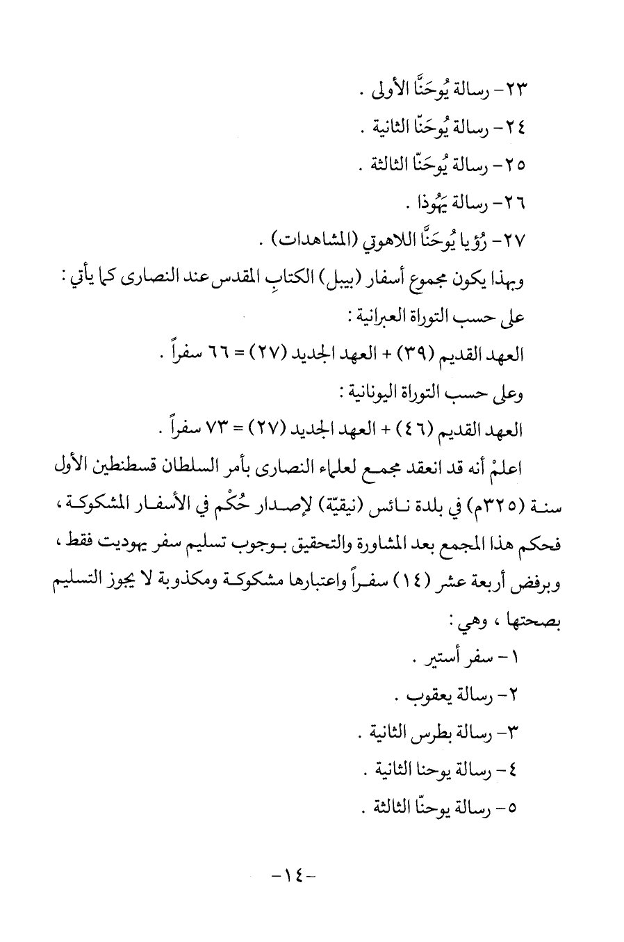 اعلم أنه قد انعقد مجمع لعلماء النصارى بأمر السلطان قسطنطين الأول سنة (325م) في بلدة نائس (نيقية) لإصدار حكم في الأسفار المشكوكة، فحكم هذا المجمع يعد المشاورة والتحقيق بوجوب تسليم سفر يهوديت فقط، وبرفض أربعة عشر (14) سفرا واعتبارها مشكوكة ومكذوبة لا يجوز التسليم بصحتها، وهي: