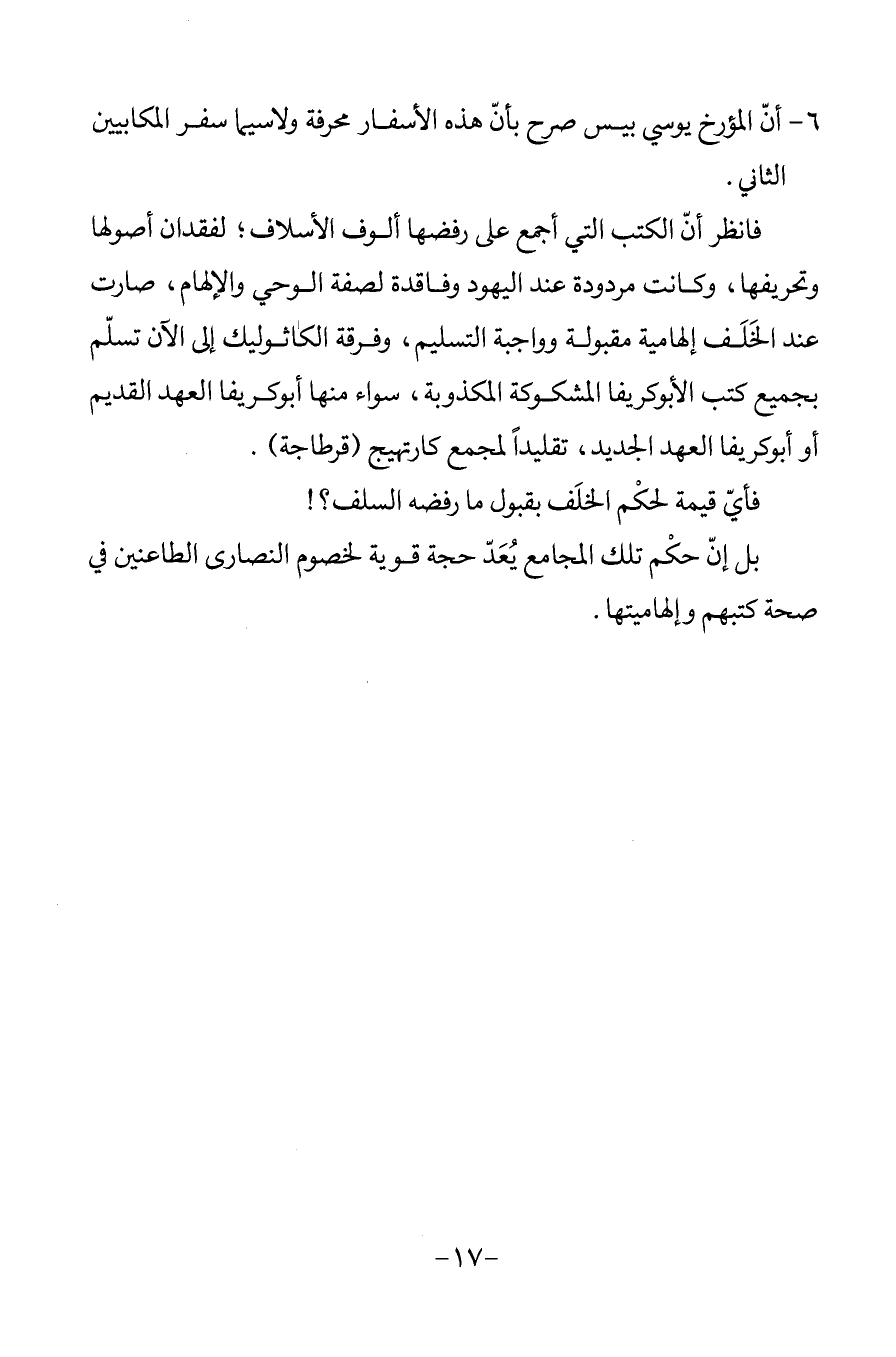 فانظر إن الكتب التي أجمع على رفضها ألوف الأسلاف؛ لفقدان أصولها وتحريفها، وكانت مردودة عند اليهود وفاقدة لصفة الوحي والإلهام، صارت عند الخلف إلهامية مقبولة وواجبة التسليم، وفرقة الكاثوليك إلى الآن تسلم بجميع كتب الأبوكريفا المشكوكة المكذوبة، سواء منها أبوكريفا العهد القديم أو أبوكريفا العهد الجديد، تقليدا لمجمع كارتهيج (قرطاجة) .