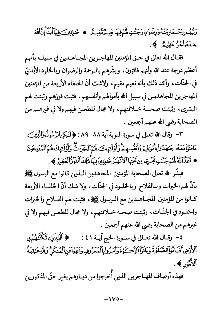 فقال الله تعالى في حق المؤمنين المهاجرين المجاهدين في سبيله بأنهم أعظم درجة عند الله وأنهم فائزون، وبشرهم بالرحمة والرضوان وبالخلود الأبدي في الجنات، وأكد ذلك بأنه نعيم مقيم، ولا شك أن الخلفاء الأربعة من المؤمنين المهاجرين المجاهدين في سبيل الله بأموالهم وأنفسهم، فثبت فوزهم وثبتت لهم البشرى، وثبتت صحة خلافتهم، ولا مجال للطعن فيهم ولا في غيرهم من الصحابة رضي الله عنهم أجمعين.