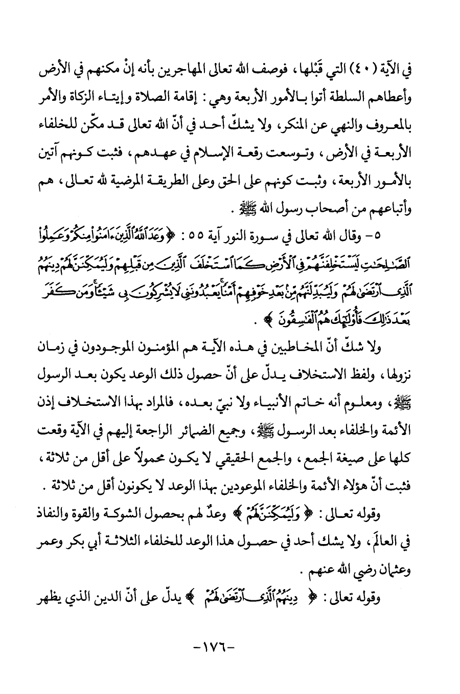 ولا شك أن المخاطبين في هذه الآية هم المؤمنون الموجودون في زمان نزولها، ولفظ الاستخلاف يدل على أن حصول ذلك الوعد يكون بعد الرسول صلى الله عليه وسلم، ومعلوم أنه خاتم الأنبياء ولا نبي بعده، فالمراد بهذا الاستخلاف إذن الأئمة والخلفاء بعد الرسول صلى الله عليه وسلم، وجميع الضمائر الراجعة إليهم في الآية وقعت كلها على صيغة الجمع، والجمع الحقيقي لا يكون محمولا على أقل من ثلاثة، فثبت أن هؤلاء الأئمة والخلفاء الموعودين بهذا الوعد لا يكونون أقل من ثلاثة.
