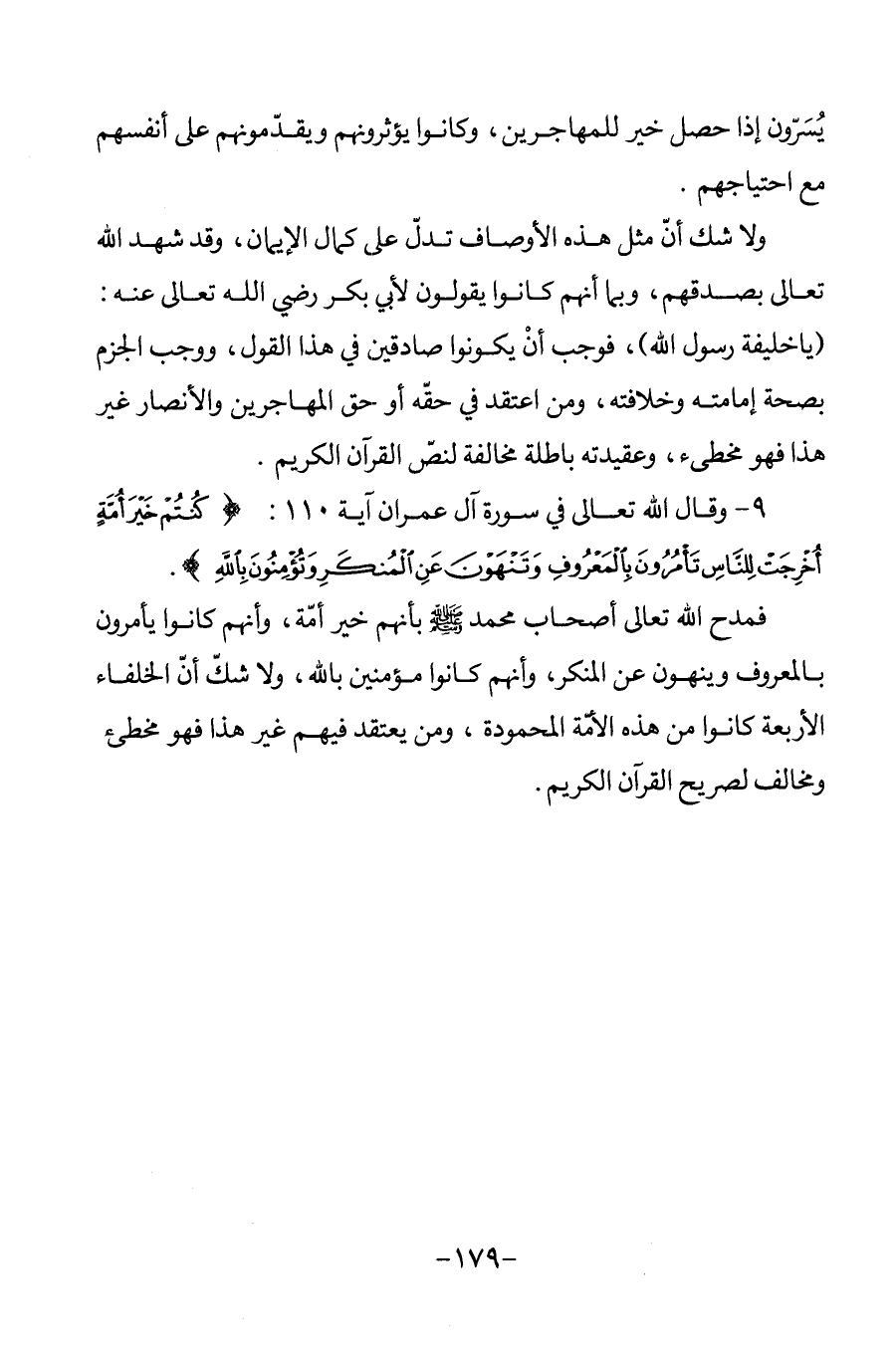ولا شك أن مثل هذه الأوصاف تدل على كمال الإيمان، وقد شهد الله تعالى بصدقهم، وبما أنهم كانوا يقولون لأبي بكر رضي الله تعالى عنه: (يا خليفة رسول الله) ، فوجب أن يكونوا صادقين في هذا القول، ووجب الجزم بصحة إمامته وخلافته، ومن اعتقد في حقه أو حق المهاجرين والأنصار غير هذا فهو مخطئ، وعقيدته باطلة مخالفة لنص القرآن الكريم.