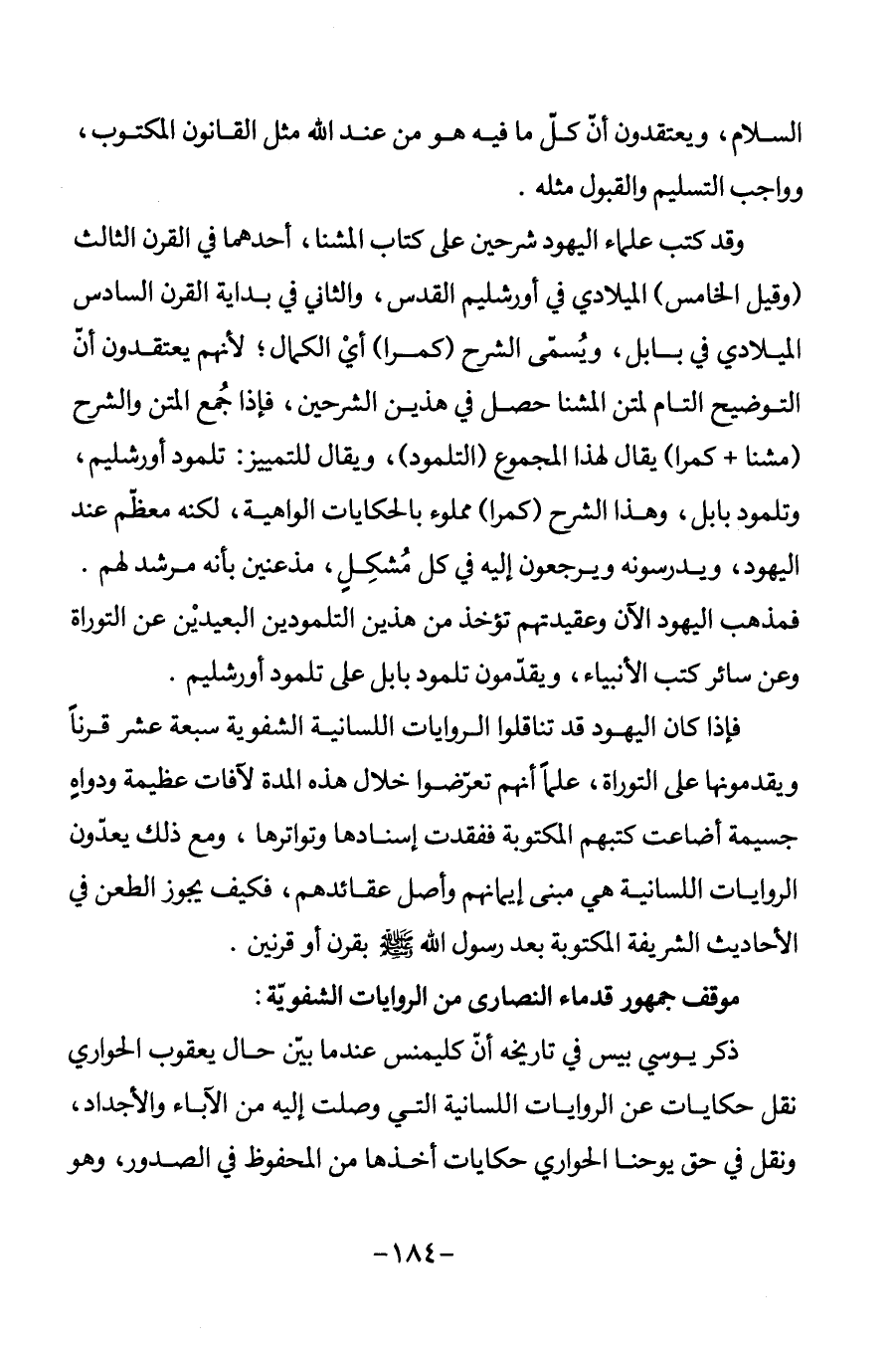 فإذا كان اليهود قد تناقلوا الروايات اللسانية الشفوية سبعة عشر قرنا ويقدمونها على التوراة، علما أنهم تعرضوا خلال هذه المدة لآفات عظيمة ودواهٍ جسيمة أضاعت كتبهم المكتوبة ففقدت إسنادها وتواترها، ومع ذلك يعدون الروايات اللسانية هي مبنى إيمانهم وأصل عقائدهم، فكيف يجوز الطعن في الأحاديث الشريفة المكتوبة بعد رسول الله صلى الله عليه وسلم بقرن أو قرنين.