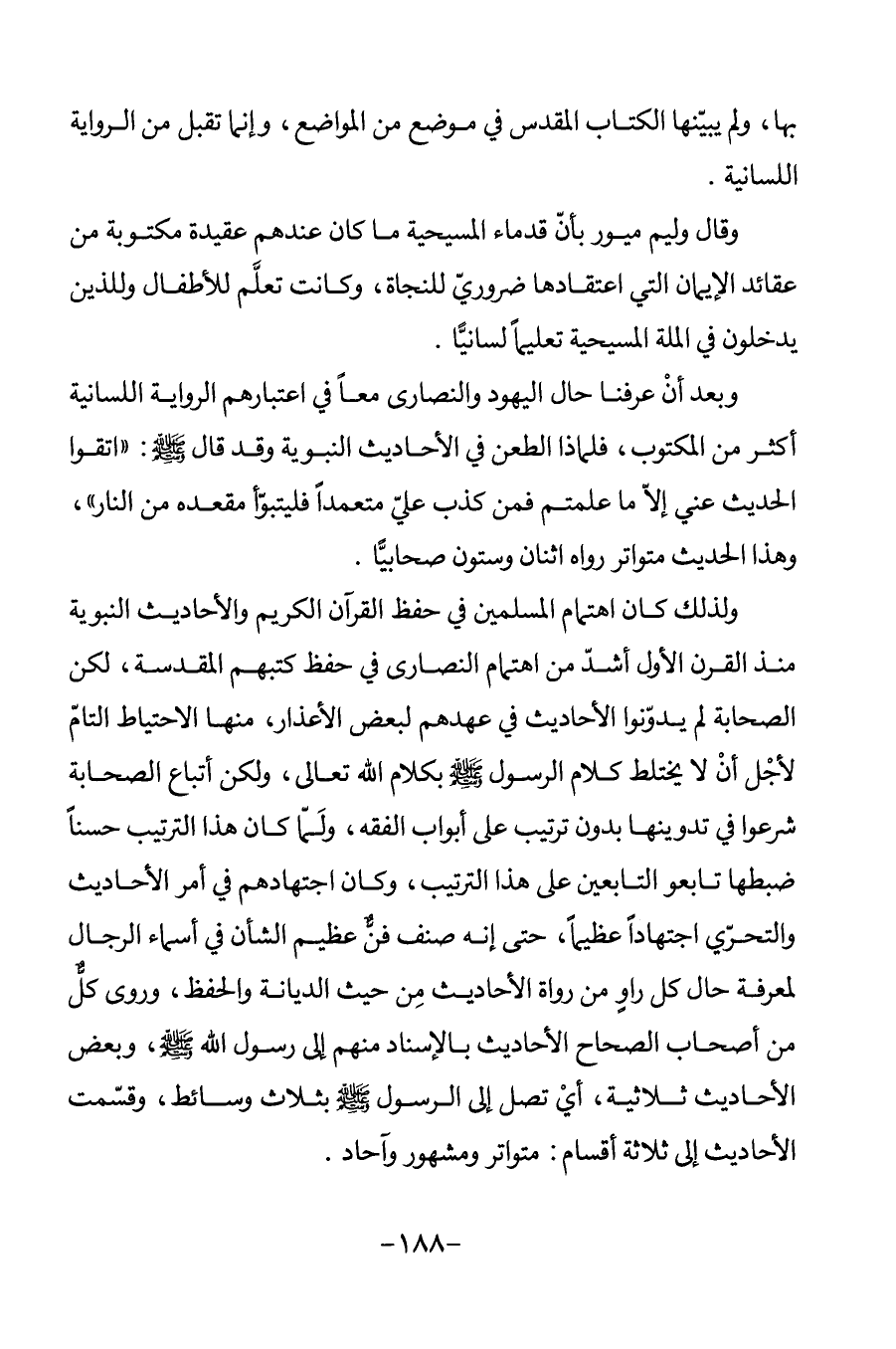 ولذلك كان اهتمام المسلمين في حفظ القرآن الكريم والأحاديث النبوية منذ القرن الأول أشد من اهتمام النصارى في حفظ كتبهم المقدسة، لكن الصحابة لم يدونوا الأحاديث في عهدهم لبعض الأعذار، منها الاحتياط التام لأجل أن لا يختلط كلام الرسول صلى الله عليه وسلم بكلام الله تعالى، ولكن أتباع الصحابة شرعوا في تدوينها بدون ترتيب على أبواب الفقه، ولما كان هذا الترتيب حسنا ضبطها تابعو التابعين على هذا الترتيب، وكان اجتهادهم في أمر الأحاديث والتحري اجتهادا عظيما، حتى إنه صنف فن عظيم الشأن في أسماء الرجال لمعرفة حال كل راو من رواة الأحاديث من حيث الديانة والحفظ، وروى كل من أصحاب الصحاح الأحاديث بالإسناد منهم إلى رسول الله صلى الله عليه وسلم، وبعض الأحاديث ثلاثية، أي تصل إلى الرسول صلى الله عليه وسلم بثلاث وسائط، وقسمت الأحاديث إلى ثلاثة أقسام: متواتر ومشهور وآحاد.