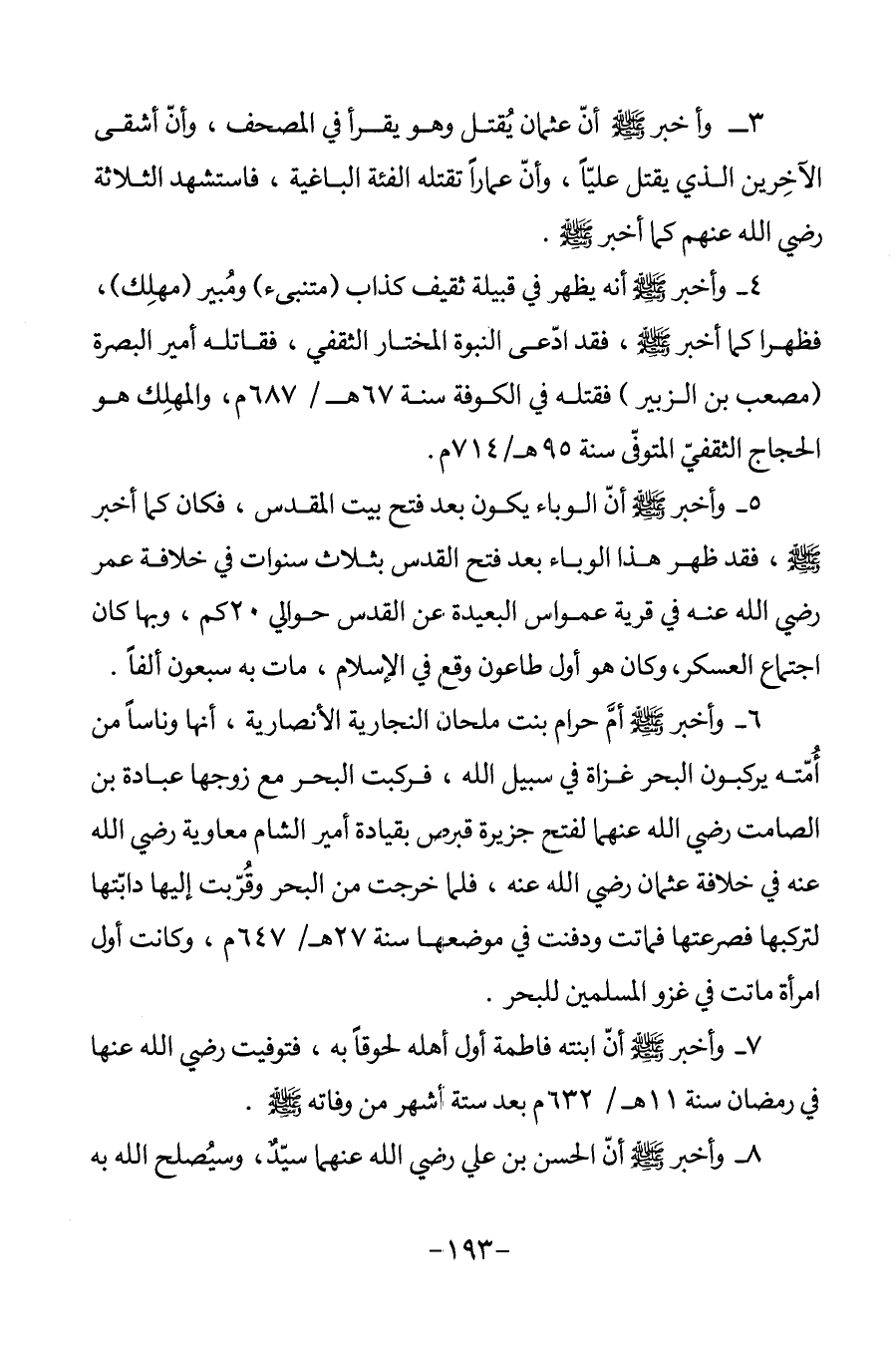 وأخبر صلى الله عليه وسلم أن عثمان يقتل وهو يقرأ في المصحف، وأن أشقى الآخرين الذي يقتل عليا، وأن عمارا تقتله الفئة الباغية، فاستشهد الثلاثة رضي الله عنهم كما أخبر صلى الله عليه وسلم.