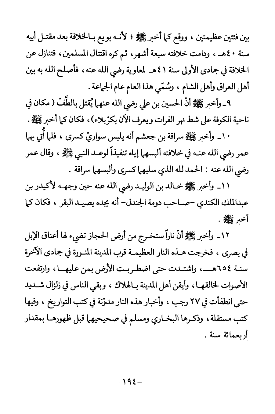 - وأخبر صلى الله عليه وسلم أن نارا ستخرج من أرض الحجاز تضيء لها أعناق الإبل في بصرى، فخرجت هذه النار العظيمة قرب المدينة المنورة في جمادى الآخرة سنة 654 هـ، واشتدت حتى اضطربت الأرض بمن عليها، وارتفعت الأصوات لخالقها، وأيقن أهل المدينة بالهلاك، وبقي الناس في زلزال شديد حتى انطفأت في 27 رجب، وأخبار هذه النار مدونة في كتب التواريخ، وفيها كتب مستقلة، وذكرها البخاري ومسلم في صحيحيهما قبل ظهورها بمقدار أربعمائة سنة.