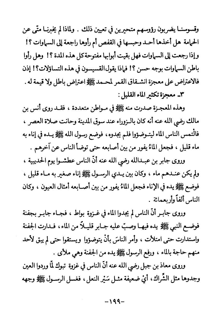 3 - معجزة تكثير الماء القليل: وهذه المعجزات صدرت منه صلى الله عليه وسلم في مواطن متعددة، فقد «روى أنس بن مالك رضي الله عنه أنه كان بالزوراء عند سوق المدينة وحانت صلاة العصر، فالتمس الناس الماء ليتوضؤوا فلم يجدوه، فوضع رسول الله صلى الله عليه وسلم يده في إناء به ماء قليل، فجعل الماء يفور من بين أصابعه حتى توضأ الناس عن آخرهم.»