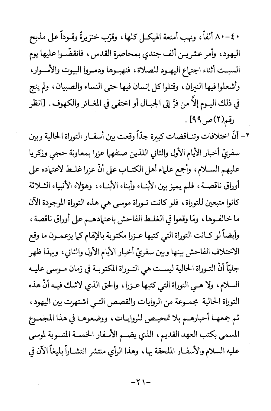 2 - أن اختلافات وتناقضات كبيرة جدا وقعت بين أسفار التوراة الحالية وبين سفري أخبار الأيام الأول والثاني اللذين صنفهما عزرا بمعاونة حجي وزكريا عليهم السلام، وأجمع علماء أهل الكتاب على أن عزرا غلط لاعتماده على أوراق ناقصة، فلم يميز بين الأبناء وأبناء الأبناء، وهؤلاء الأنبياء الثلاثة كانوا متبعين للتوراة، فلو كانت توراة موسى هي هذه التوراة الموجودة الآن ما خالفوها، وما وقعوا في الغلط الفاحش باعتمادهم على أوراق ناقصة، وأيضا لو كانت التوراة التي كتبها عزرا مكتوبة بالإلهام كما يزعمون ما وقع الاختلاف الفاحش بينها وبين سفري أخبار الأيام الأول والثاني، وبهذا ظهر جليا أن التوراة الحالية ليست هي التوراة المكتوبة في زمان موسى عليه السلام، ولا هي التوراة التي كتبها عزرا، والحق الذي لا شك فيه أن هذه التوراة الحالية مجموعة من الروايات والقصص التي اشتهرت بين اليهود، ثم جمعها أحبارهم بلا تمحيص للروايات، ووضعوها في هذا المجموع المسمى بكتب العهد القديم، الذي يضم الأسفار الخمسة المنسوبة لموسى عليه السلام والأسفار الملحقة بها، وهذا الرأي منتشر انتشارا بليغا الآن في