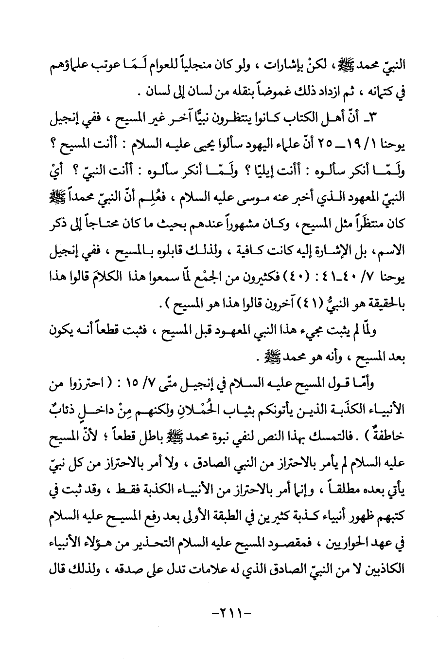 3 - أن أهل الكتاب كانوا ينتظرون نبيا آخر غير المسيح، ففي إنجيل يوحنا 1 / 19 -25 أن علماء اليهود سألوا يحيى عليه السلام: أأنت المسيح؟ ولما أنكر سألوه: أأنت إيليا؟ ولما أنكر سألوه: أأنت النبي؟ أي النبي المعهود الذي أخبر عنه موسى عليه السلام، فعلم أن النبي محمد صلى الله عليه وسلم كان منتظرا مثل المسيح، وكان مشهورا عندهم بحيث ما كان محتاجا إلى ذكر الاسم، بل الإشارة إليه كانت كافية، ولذلك قابلوه بالمسيح، ففي إنجيل يوحنا 7 / 40 -41: (40) فكثيرون من الجمع لما سمعوا هذا الكلام قالوا هذا بالحقيقة هو النبي (41) آخرون قالوا هذا هو المسيح) .