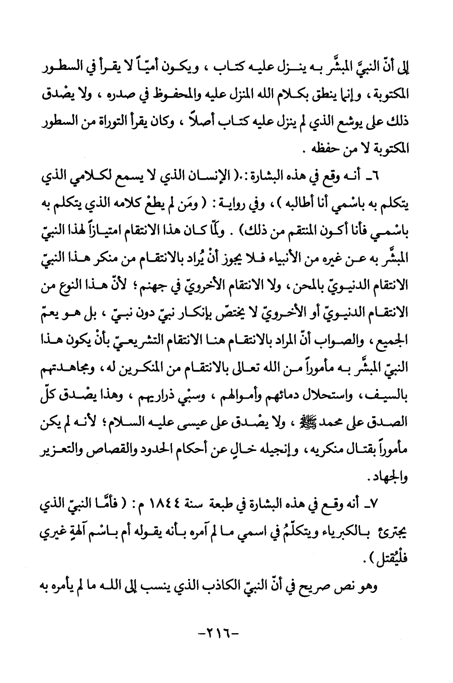 6 - أنه وقع في هذه البشارة: (الإنسان الذي لا يسمع لكلامي الذي يتكلم به باسمي أنا أطالبه) ، وفي رواية: (ومن لم يطع كلامه الذي يتكلم به باسمي فأنا أكون المنتقم من ذلك) . ولما كان هذا الانتقام امتيازا لهذا النبي المبشر به عن غيره من الأنبياء فلا يجوز أن يراد بالانتقام من منكر هذا النبي الانتقام الدنيوي بالمحن، ولا الانتقام الأخروي في جهنم؛ لأن هذا النوع من الانتقام الدنيوي أو الأخروي لا يختص بإنكار نبي دون نبي، بل هو يعم الجميع، والصواب أن المراد بالانتقام هنا الانتقام التشريعي بأن يكون هذا النبي المبشر به مأمورا من الله تعالى بالانتقام من المنكرين له، ومجاهدتهم بالسيف، واستحلال دمائهم وأموالهم، وسبي ذراريهم، وهذا يصدق كل الصدق على محمد صلى الله عليه وسلم، ولا يصدق على عيسى عليه السلام؛ لأنه لم يكن مأمورا بقتال منكريه، وإنجيله خال عن أحكام الحدود والقصاص والتعزير والجهاد.