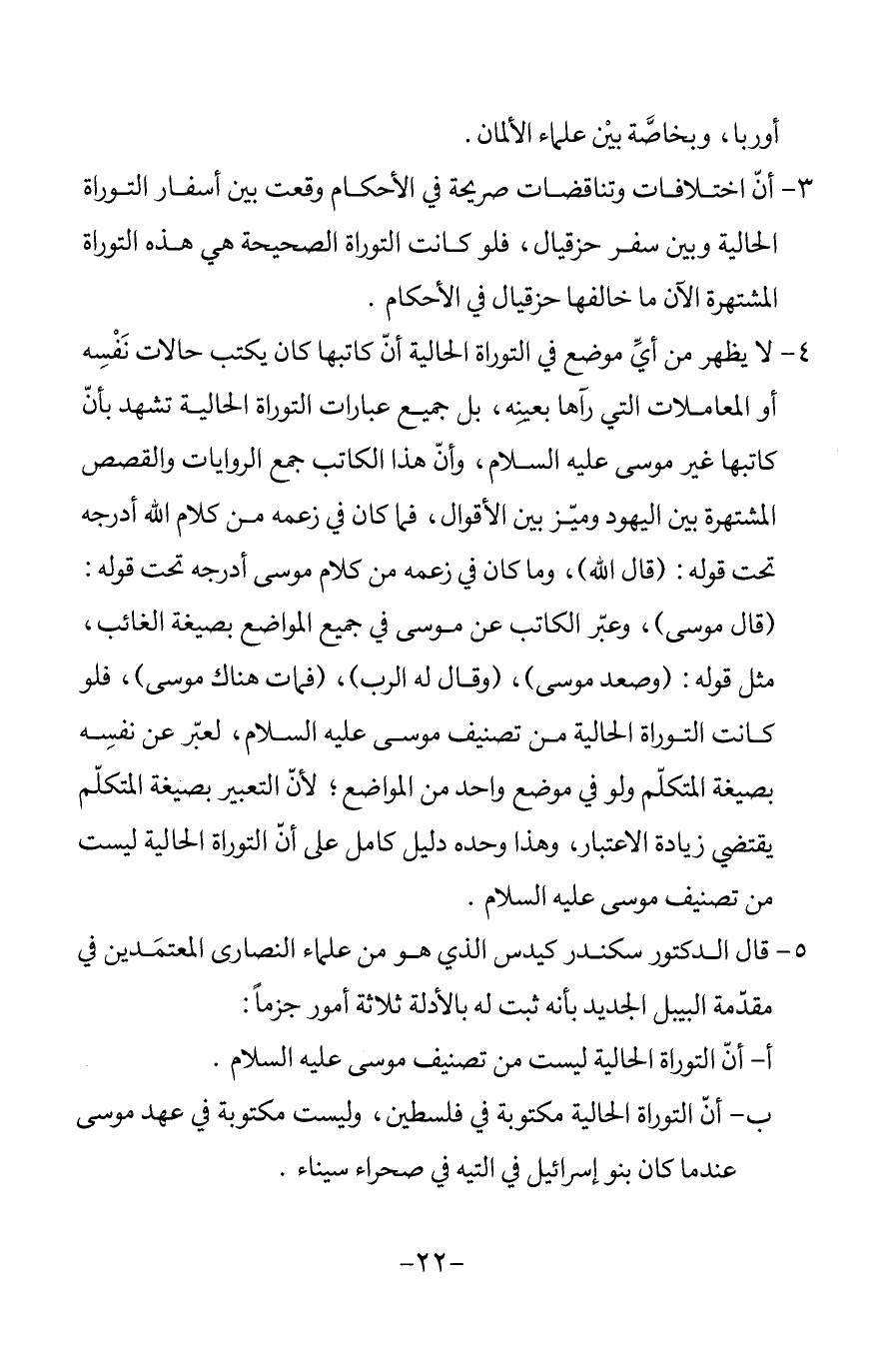 4 - لا يظهر من أي موضع في التوراة الحالية أن كاتبها كان يكتب حالات نفسه أو المعاملات التي رآها بعينه، بل جميع عبارات التوراة الحالية تشهد بأن كاتبها غير موسى عليه السلام، وأن هذا الكاتب جمع الروايات والقصص المشتهرة بين اليهود وميز بين الأقوال، فما كان في زعمه من كلام الله أدرجه تحت قوله: (قال الله) ، وما كان في زعمه من كلام موسى أدرجت تحت قوله: (قال موسى) ، وعبر الكاتب عن موسى في جميع المواضع بصيغة الغائب، مثل قوله: (وصعد موسى) ، (وقال له الرب) ، (فمات هناك موسى) ، فلو كانت التوراة الحالية من تصنيف موسى عليه السلام، لعبر عن نفسه بصيغة المتكلم ولو في موضع واحد من المواضع؛ لأن التعبير بصيغة المتكلم يقتضي زيادة الاعتبار، وهذا وحده دليل كامل على أن التوراة الحالية ليست من تصنيف موسى عليه السلام.