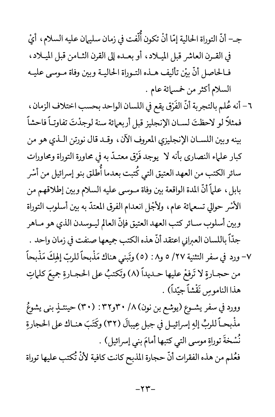 6 - أنه علم بالتجربة أن الفرق يقع في اللسان الواحد بحسب اختلاف الزمان، فمثلا لو لاحظت لسان الإنجليز قبل أربعمائة سنة لوجدت تفاوتا فاحشا بينه وبين اللسان الإنجليزي المعروف الآن، وقد قال نورتن الذي هو من كبار علماء النصارى بأنه لا يوجد فرق معتد به في محاورة التوراة ومحاورات سائر الكتب من العهد العتيق التي كتبت بعدما أطلق بنو إسرائيل من أسر بابل، علما أن المدة الواقعة بين وفاة موسى عليه السلام وبين إطلاقهم من الأسر حوالي تسعمائة عام، ولأجل انعدام الفرق المعتد بين أسلوب التوراة وبين أسلوب سائر كتب العهد العتيق فإن العالم ليوسدن الذي هو ماهر جدا باللسان العبراني اعتقد أن هذه الكتب جميعها صنفت في زمان واحد.