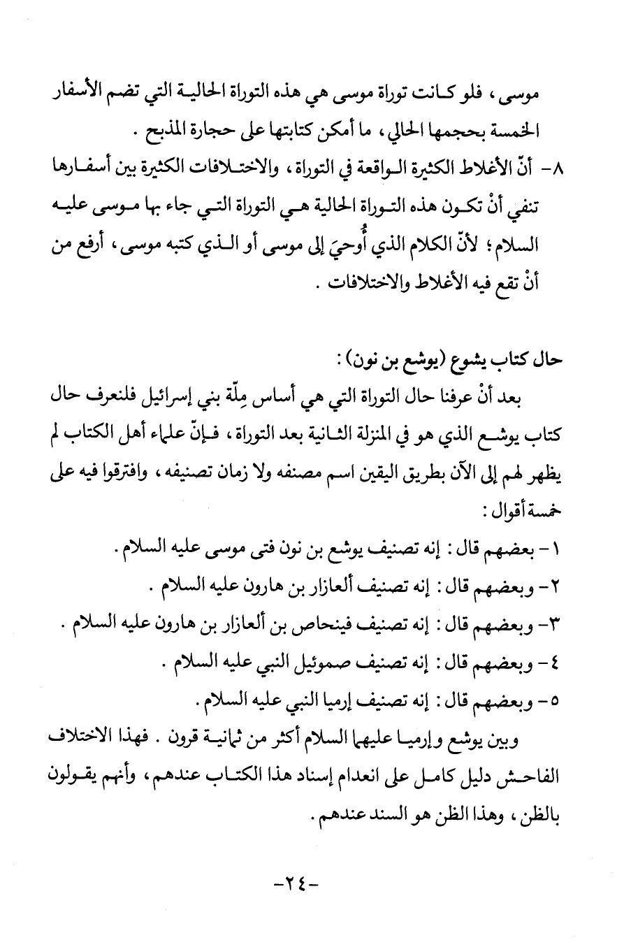 حال كتاب يشوع (يوشع بن نون) : بعد أن عرفنا حال التوراة التي هي أساس ملة بني إسرائيل فلنعرف حال كتاب يوشع الذي هو في المنزلة الثانية بعد التوراة، فإن علماء أهل الكتاب لم يظهر لهم إلى الآن بطريق اليقين اسم مصنفه ولا زمان تصنيفه، وافترقوا فيه على خمسة أقوال: