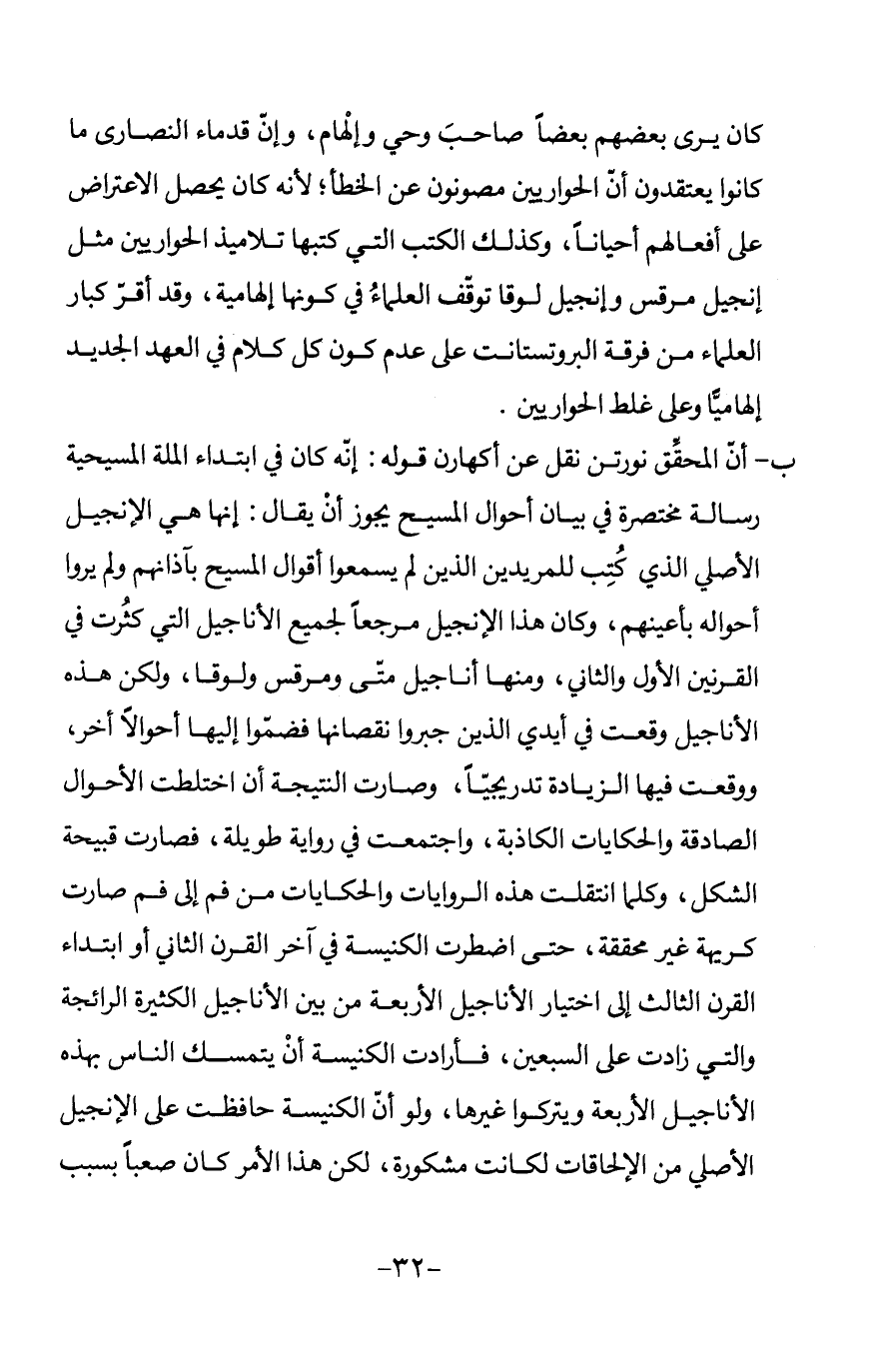 ب - أن المحقق نورتن نقل عن أكهارن قوله: إنه كان في ابتداء الملة المسيحية رسالة مختصرة في بيان أحوال المسيح يجوز أن يقال: إنها هي الإنجيل الأصلي الذي كتب للمريدين الذين لم يسمعوا أقوال المسيح بآذانهم ولم يروا أحواله بأعينهم، وكان هذا الإنجيل مرجعا لجميع الأناجيل التي كثرت في القرنين الأول والثاني، ومنها أناجيل متى ومرقس ولوقا، ولكن هذه الأناجيل وقعت في أيدي الذين جبروا نقصانها فضموا إليها أحوالا أخر، ووقعت فيها الزيادة تدريجيا، وصارت النتيجة أن اختلطت الأحوال الصادقة والحكايات الكاذبة، واجتمعت في رواية طويلة، فصارت قبيحة الشكل، وكلما انتقلت هذه الروايات والحكايات من فم إلى فم صارت كريهة غير محققة، حتى اضطرت الكنيسة في آخر القرن الثاني أو ابتداء القرن الثالث إلى اختيار الأناجيل الأربعة من بين الأناجيل الكثيرة الرائجة والتي زادت على السبعين، فأرادت الكنيسة أن يتمسك الناس بهذه الأناجيل الأربعة ويتركوا غيرها، ولو أن الكنيسة حافظت على الإنجيل الأصلي من الإلحاقات لكانت مشكورة، لكن هذا الأمر كان صعبا بسبب