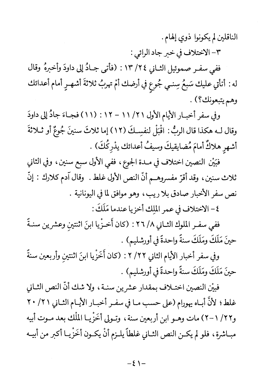 فبين النصين اختلاف في مدة الجوع، ففي الأول سبع سنين، وفي الثاني ثلاث سنين، وقد أقر مفسروهم أن النص الأول غلط. وقال آدم كلارك: إن نص سفر الأخبار صادق بلا ريب، وهو موافق لما في اليونانية.