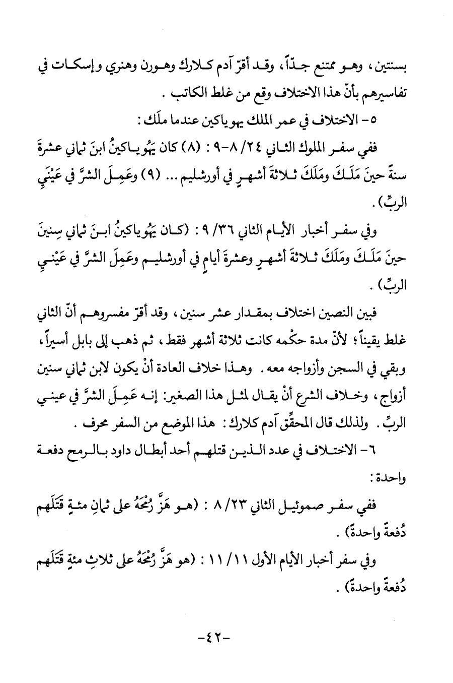 فبين النصين اختلاف بمقدار عشر سنين، وقد أقر مفسروهم أن الثاني، غلط يقينا؛ لأن مدة حكمه كانت ثلاثة أشهر فقط، ثم ذهب إلى بابل أسيرا، وبقي في السجن وأزواجه معه. وهذا خلاف العادة أن يكون لابن ثماني أزواج، وخلاف الشرع أن يقال لمثل هذا الصغير: إنه عمل الشر في عيني الرب. ولذلك قال المحقق آدم كلارك: هذا الموضع من السفر محرف.