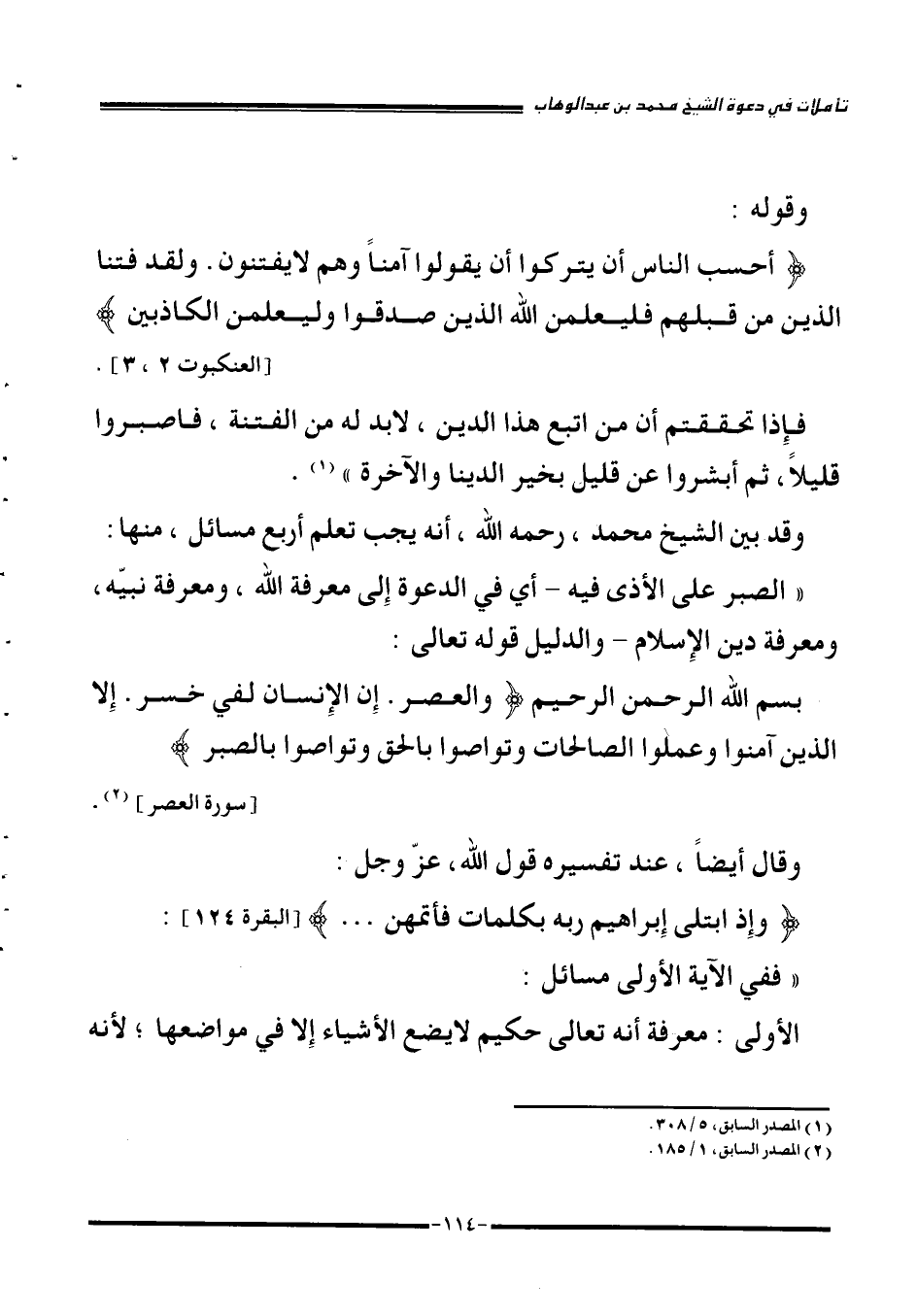 فإذا تحققتم أن من اتبع هذا الدين، لا بد له من الفتنة، فاصبروا قليلاً، ثم أبشروا عن قليل بخير الدنيا والآخرة)) 1. وقد بين الشيخ محمد، رحمه الله، أنه يجب تعلم أربع مسائل، منها: