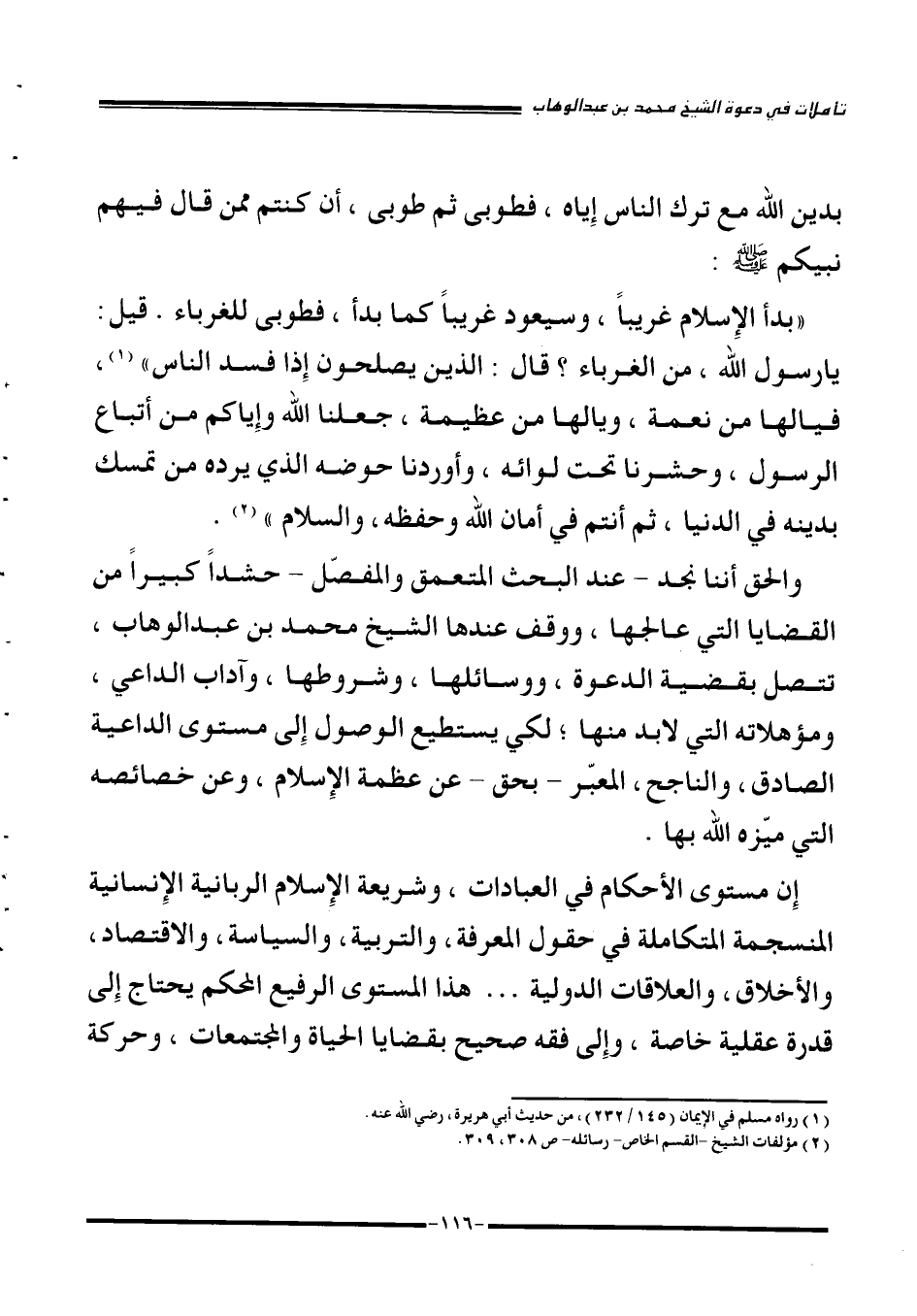 والحق أننا نجد -عند البحث المتعمق والمفصّل- حشداً كبيراً من القضايا التي عالجها، ووقف عندها الشيخ محمد بن عبد الوهاب، تتصل بقضية الدعوة، ووسائلها، وشروطها، وآداب الداعي، ومؤهلاته التي لا بد منها؛ لكي يستطيع الوصول إِلى مستوى الداعية الصادق، والناجح، المعبّر -بحق- عن عظمة الإِسلام، وعن خصائصه التي ميّزه الله بها.