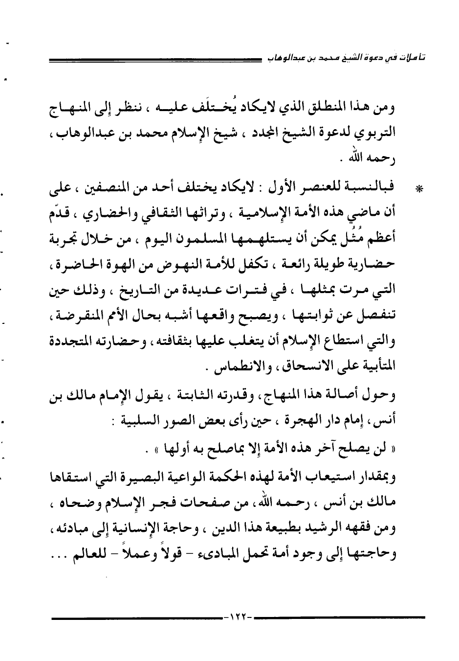 ومن هذا المنطلق الذي لا يكاد يُختلَف عليه، ننظر إِلى المنهاج التربوي لدعوة الشيخ المجدد، شيخ الإِسلام محمد بن عبد الوهاب، رحمه الله.