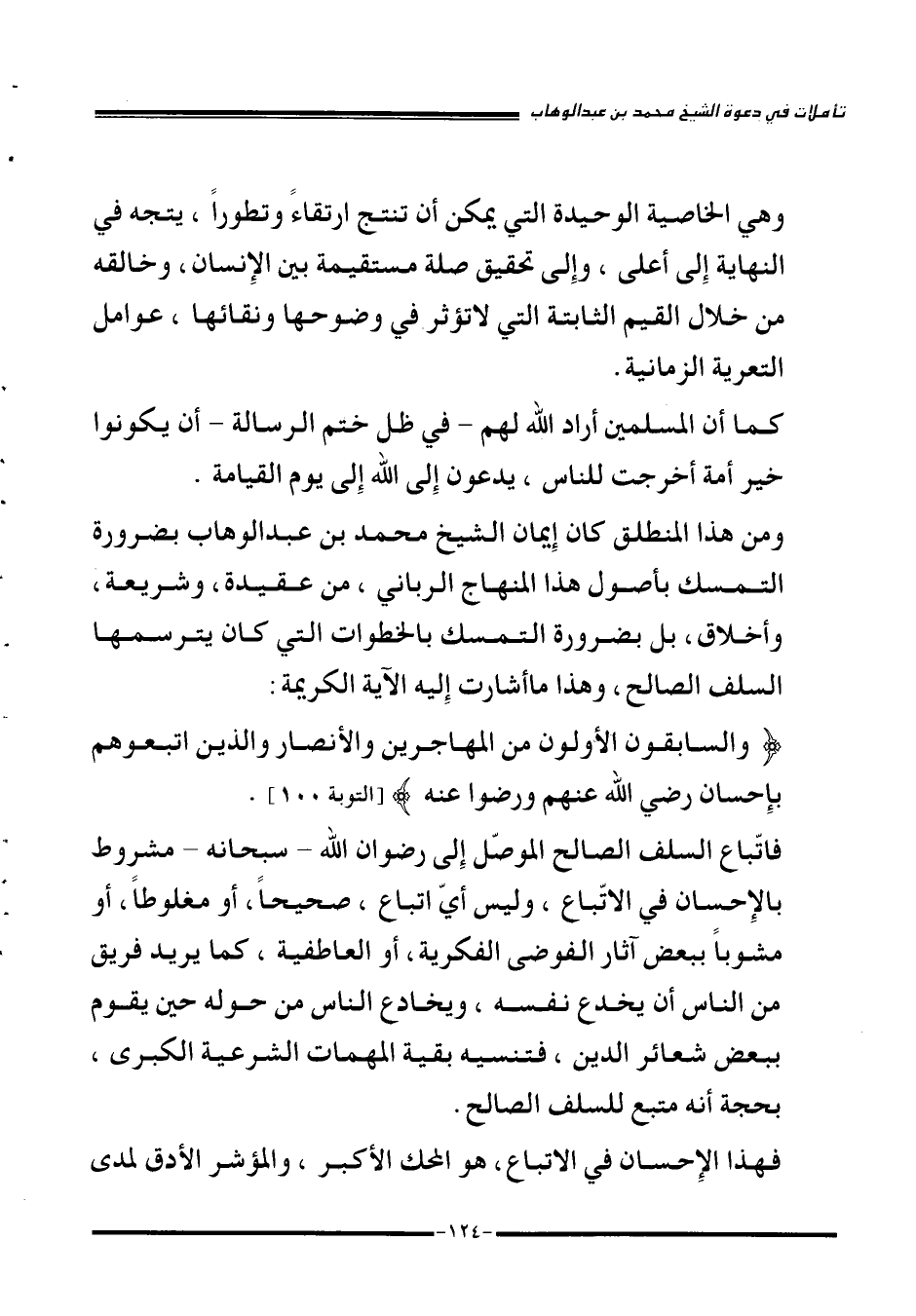ومن هذا المنطلق كان إِيمان الشيخ محمد بن عبد الوهاب بضرورة التمسك بأصول هذا المنهاج الرباني، من عقيدة، وشريعة، وأخلاق، بل بضرورة التمسك بالخطوات التي كان يترسمها السلف الصالح، وهذا ما أشارت إِليه الآية الكريمة: