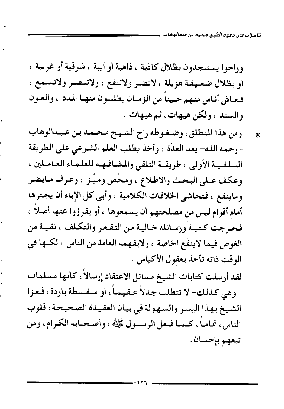 وراحوا يستنجدون بظلال كاذبة، ذاهبة أو آيبة، شرقية أو غربية، أو بظلال ضعيفة هزيلة، لا تضر ولا تنفع، ولا تبصر ولا تسمع، فعاش أناس منهم حيناً من الزمان يطلبون منها المدد، والعون والسند، ولكن هيهات، ثم هيهات. ومن هذا المنطلق، وضغوطه راح الشيخ محمد بن عبد الوهاب -رحمه الله- يعد العدّة، وأخذ يطلب العلم الشرعي على الطريقة السلفية الأولى، طريقة التلقي والمشافهة للعلماء العاملين، وعكف على البحث والاطلاع، ومحَّص وميَّز، وعرف ما يضر وما ينفع، فتحاشى الخلافات الكلامية، وأبى كل الإِباء أن يجترّها أمام أقوام ليس من مصلحتهم أن يسمعوها، أو يقرؤوا عنها أصلاً، فخرجت كتبه ورسائله خالية من التقعر والتكلف، نقية من الغوص فيما لا ينفع الخاصة، ولا يفهمه العامة من الناس، لكنها في الوقت ذاته تأخذ بعقول الأكياس. لقد أرسلت كتابات الشيخ مسائل الاعتقاد إِرسالا، كأنها مسلمات -وهي كذلك- لا تتطلب جدلاً عقيماً، أو سفسطة باردة، فغزا الشيخ بهذا اليسر والسهولة في بيان العقيدة الصحيحة، قلوب الناس، تماماً، كما فعل الرسول ـ صلّى الله عليه وسلّم ـ وأصحابه الكرام، ومن تبعهم بإِحسان.