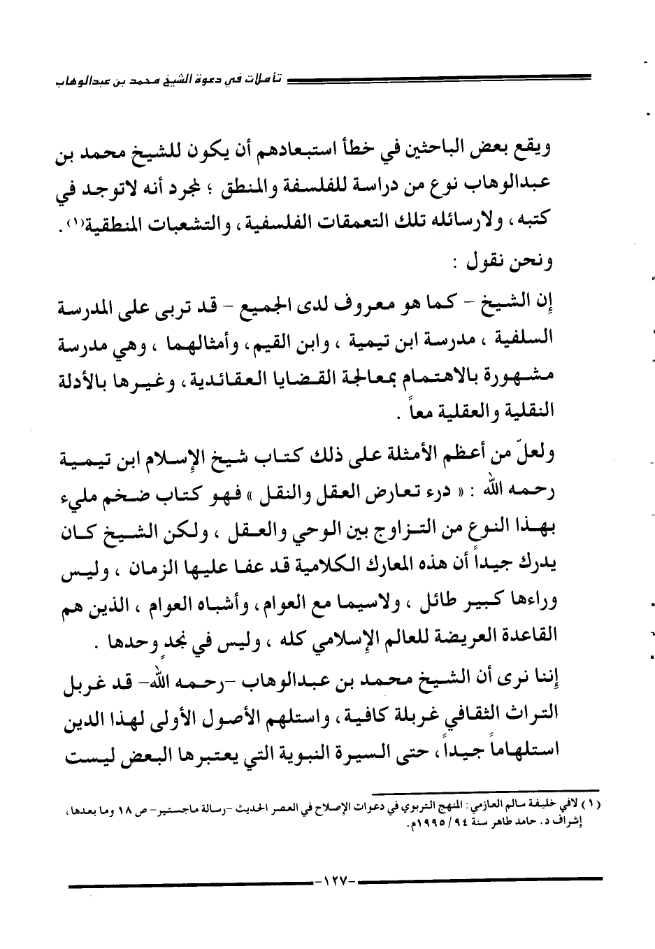 ويقع بعض الباحثين في خطأ استبعادهم أن يكون للشيخ محمد بن عبد الوهاب نوع من دراسة للفسلفة والمنطق، لمجرد أنه لا توجد في كتبه، ولا رسائله تلك التعمقات الفلسفية، والتشعبات المنطقية1.